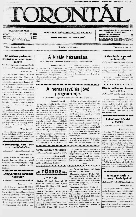 Torontál, 51. évf. 1922. január 29. 22. sz.