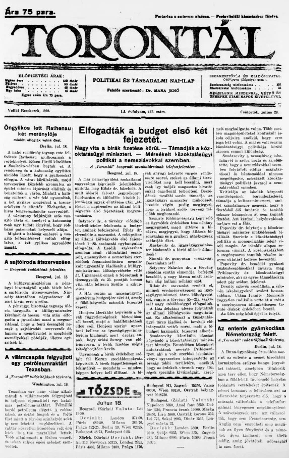 Torontál, 51. évf. 1922. július 20. 157. sz.