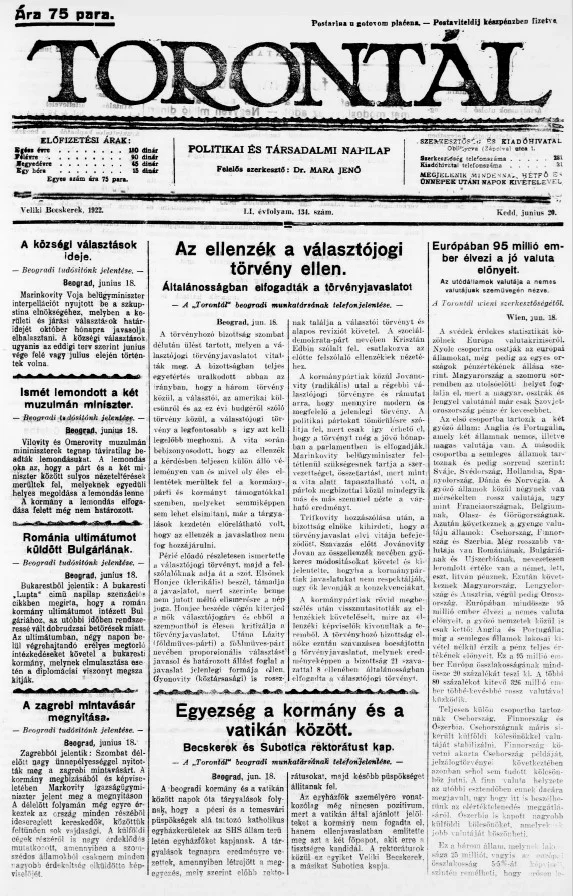 Torontál, 51. évf. 1922. június 20. 134. sz.