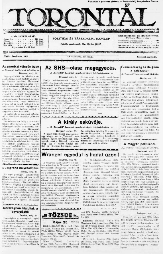 Torontál, 51. évf. 1922. május 27. 117. sz.