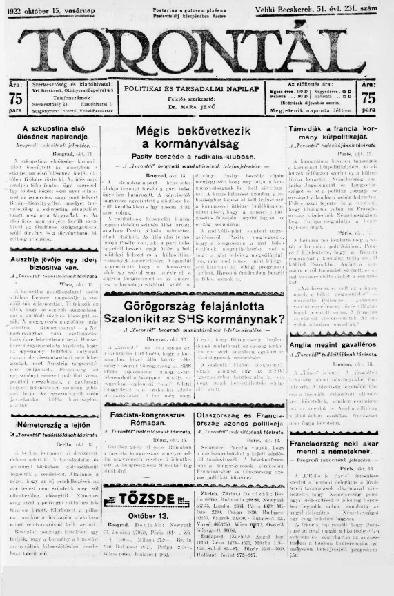 Torontál, 51. évf. 1922. október 15. 231. sz.