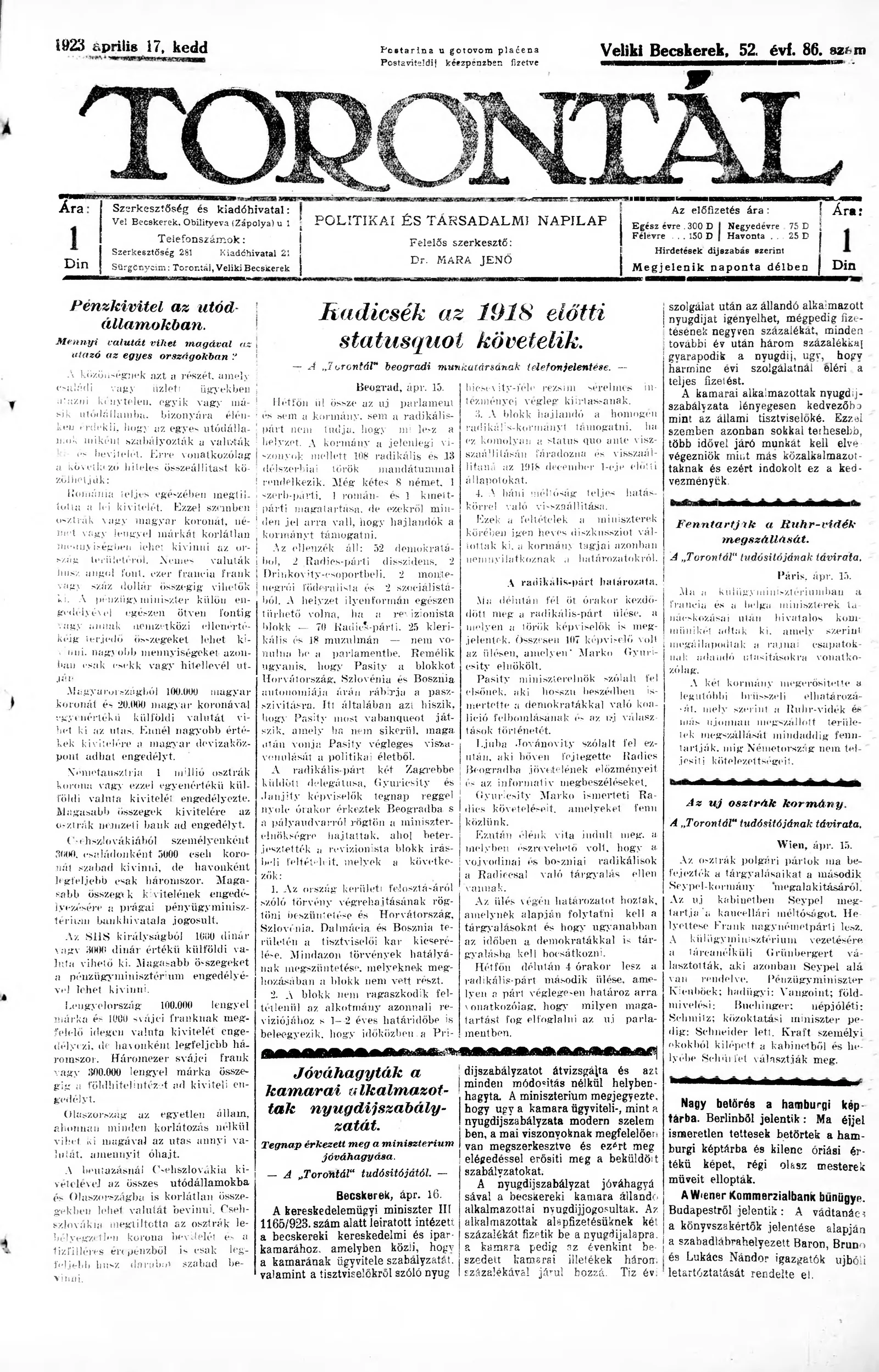 Torontál, 52. évf. 1923. április 17. 86. sz.