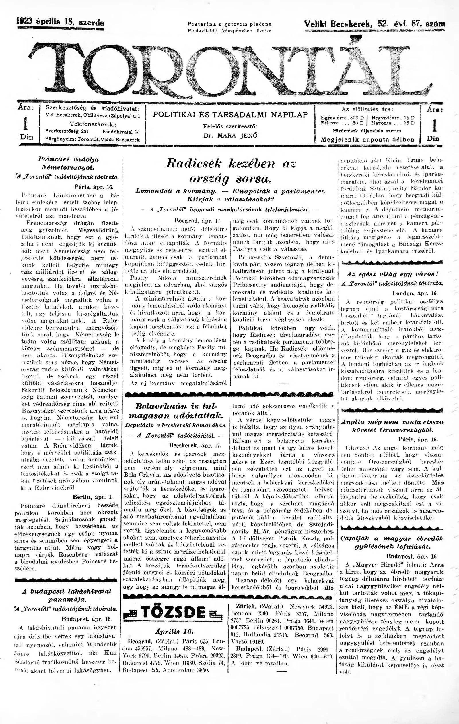 Torontál, 52. évf. 1923. április 18. 87. sz.