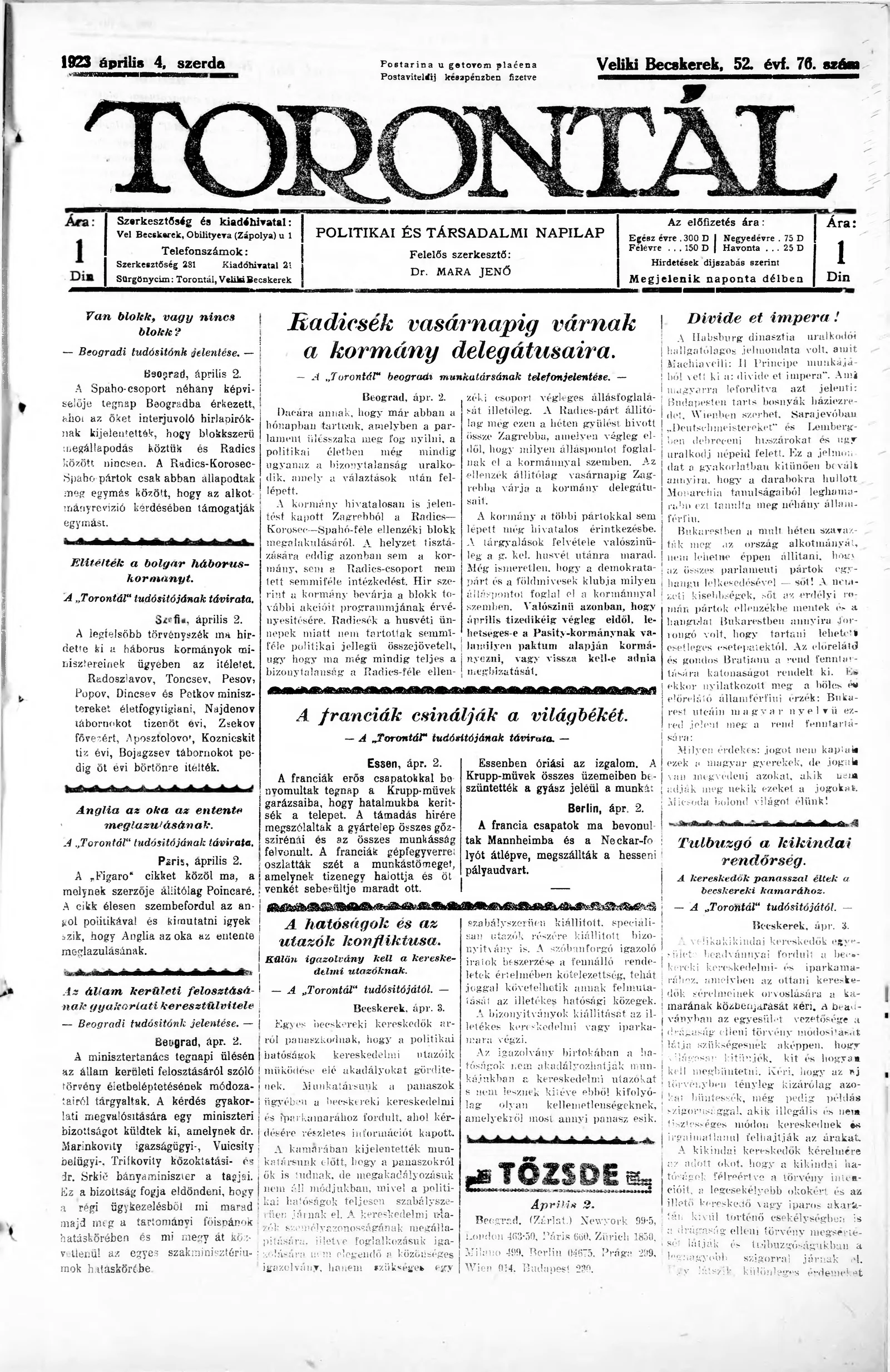Torontál, 52. évf. 1923. április 4. 76. sz.