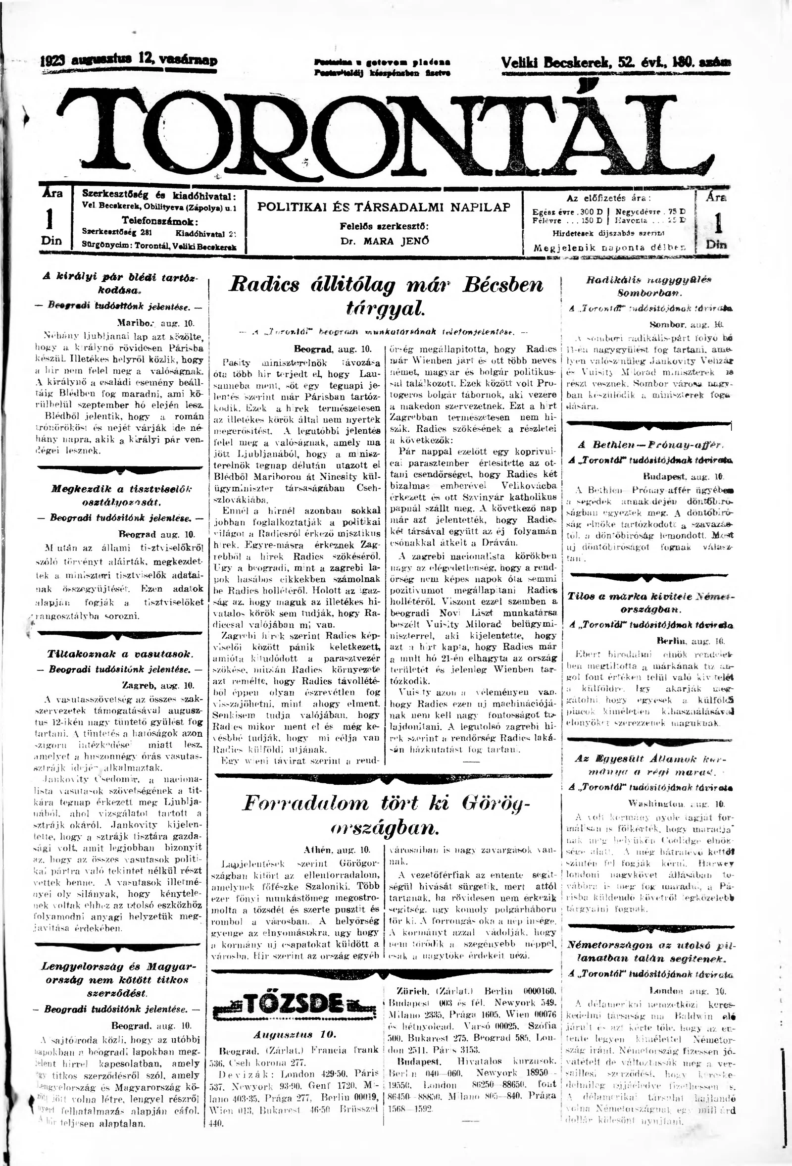 Torontál, 52. évf. 1923. augusztus 12. 180. sz.