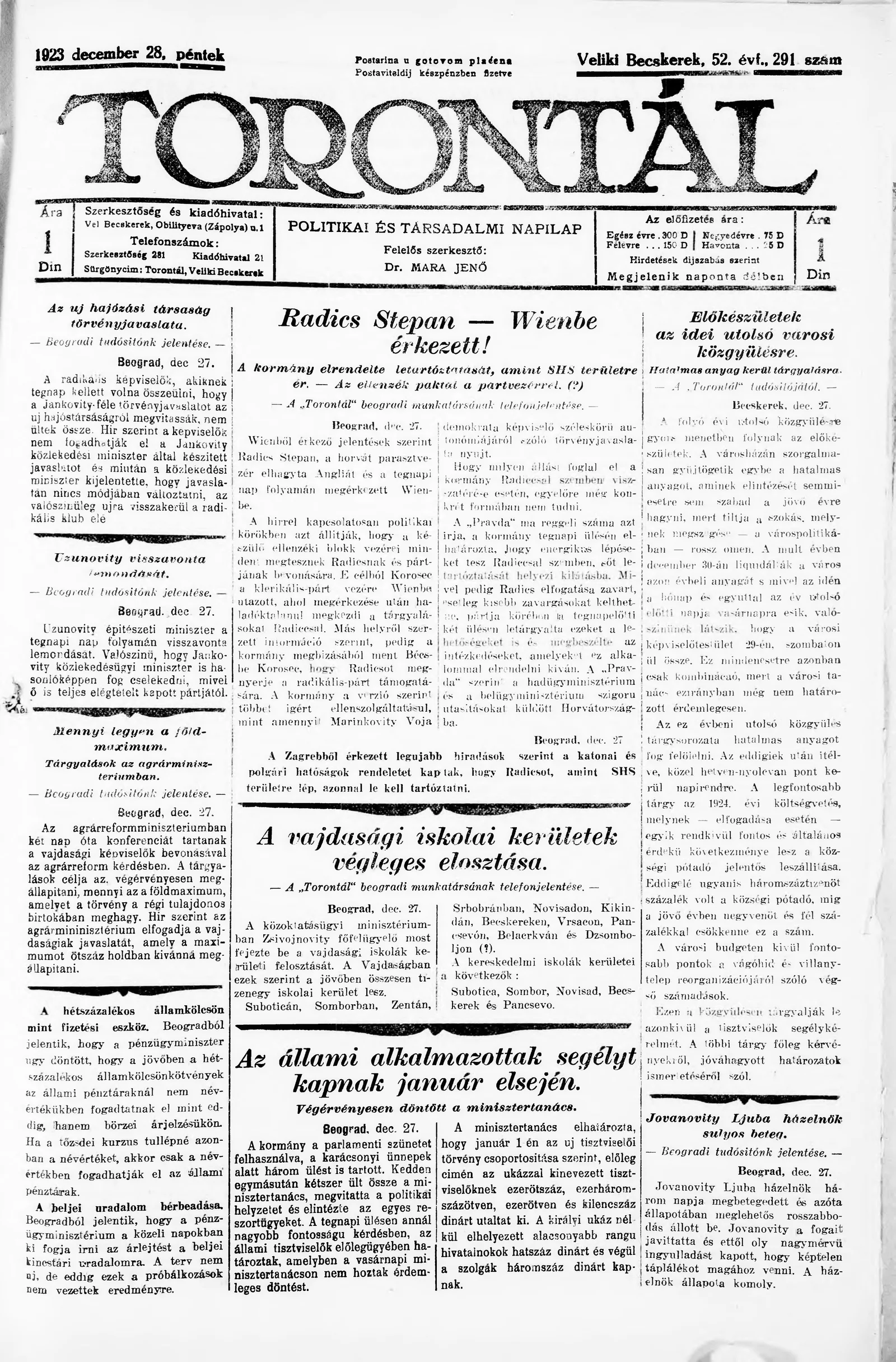 Torontál, 52. évf. 1923. december 28. 291. sz.