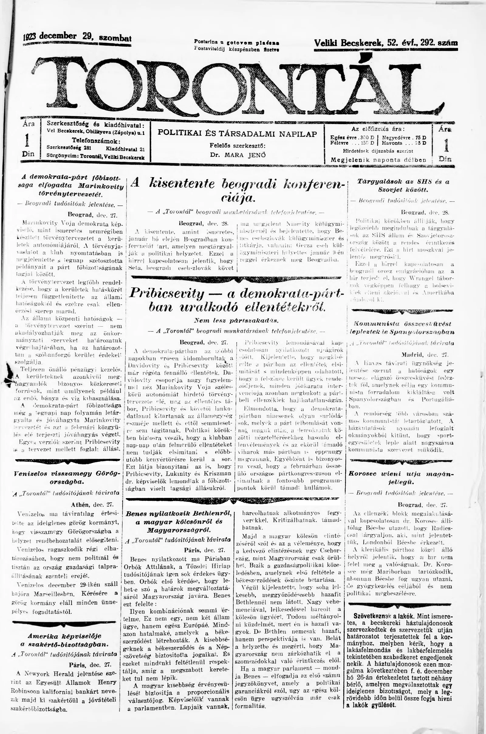 Torontál, 52. évf. 1923. december 29. 292. sz.