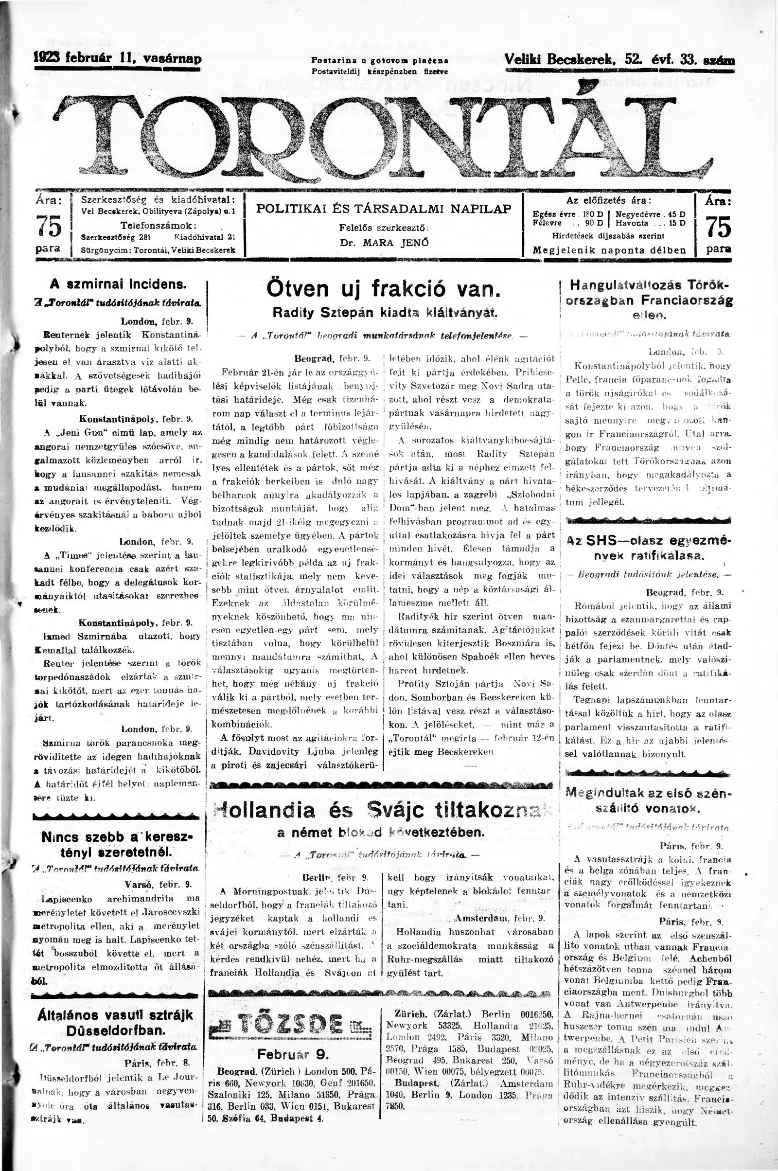 Torontál, 52. évf. 1923. február 11. 33. sz.