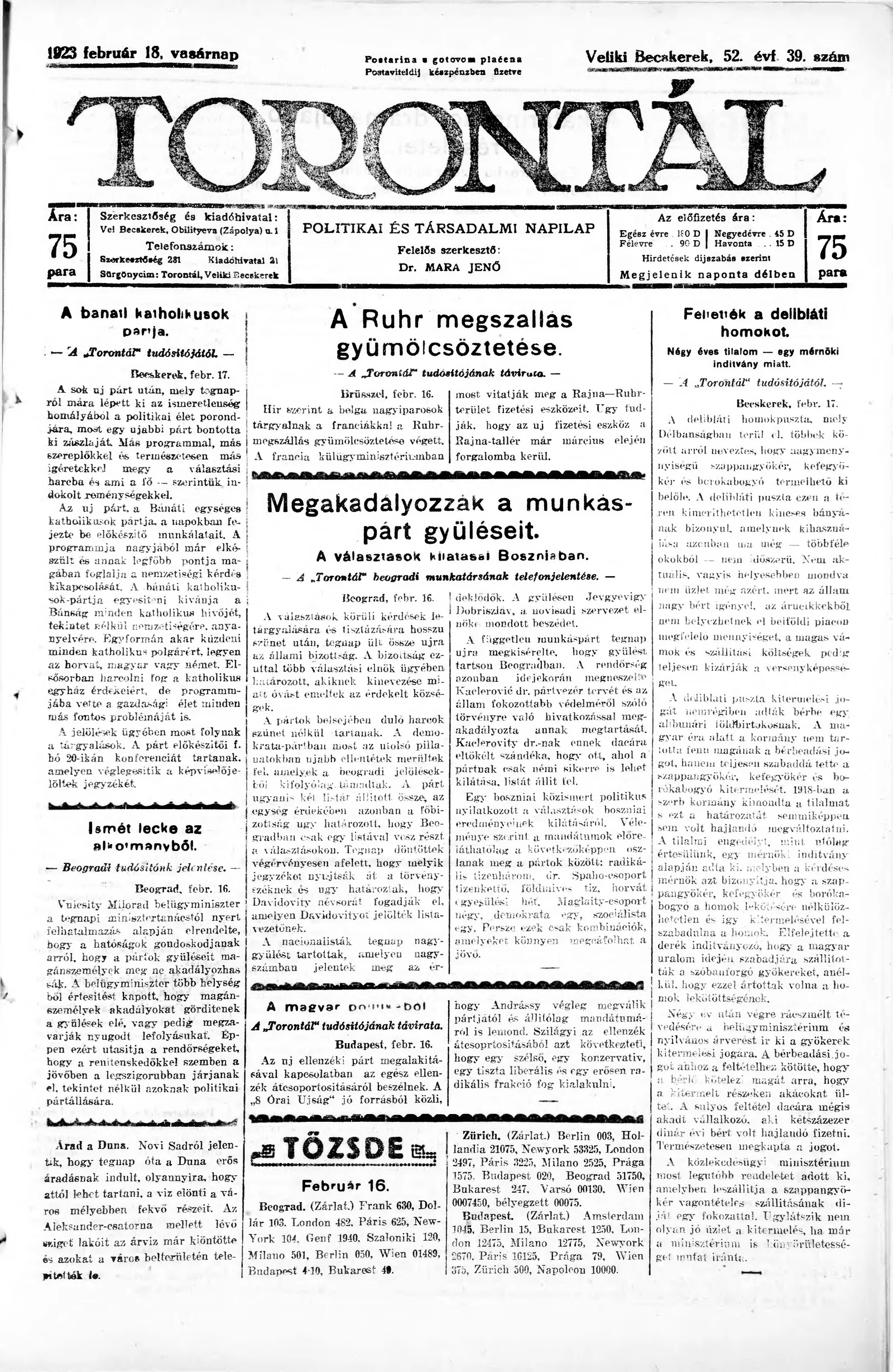 Torontál, 52. évf. 1923. február 18. 39. sz.