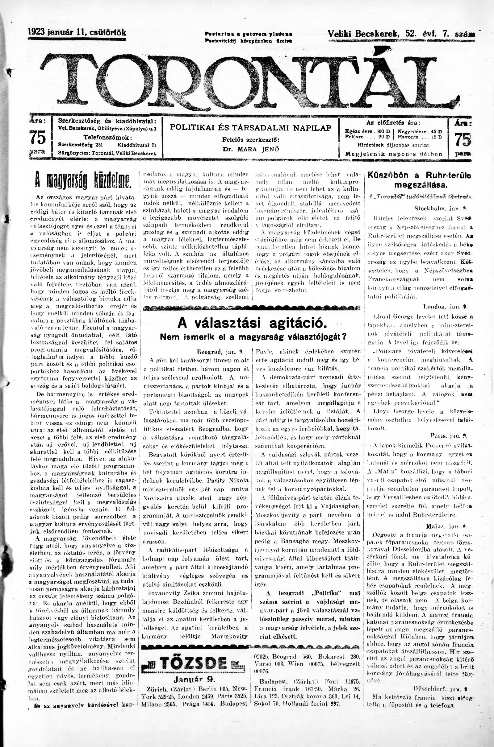 Torontál, 52. évf. 1923. január 11. 7. sz.