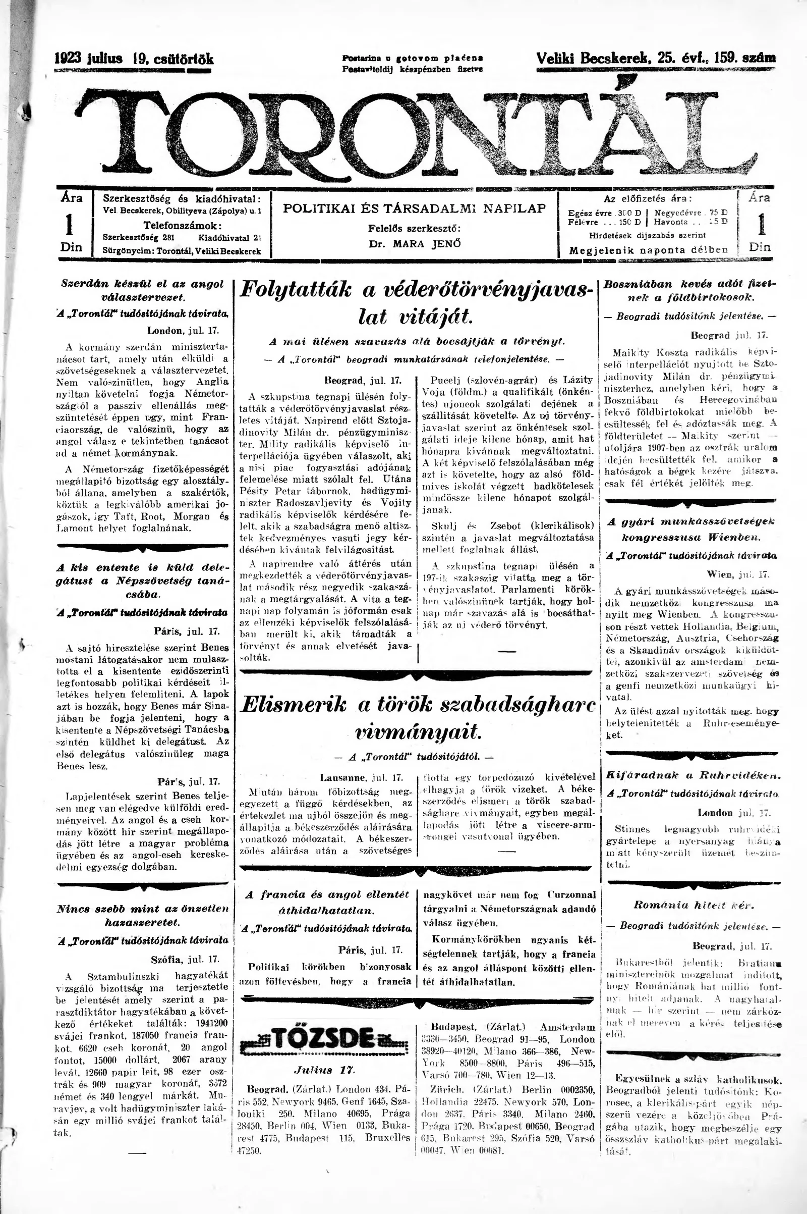 Torontál, 52. évf. 1923. július 19. 159. sz.