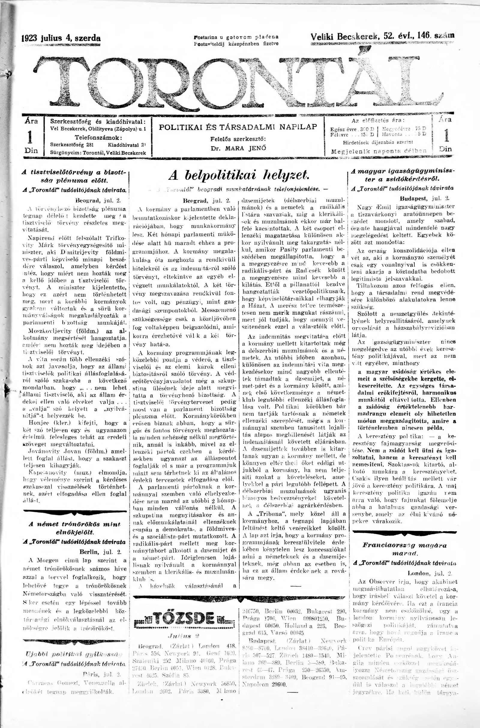 Torontál, 52. évf. 1923. július 4. 146. sz.