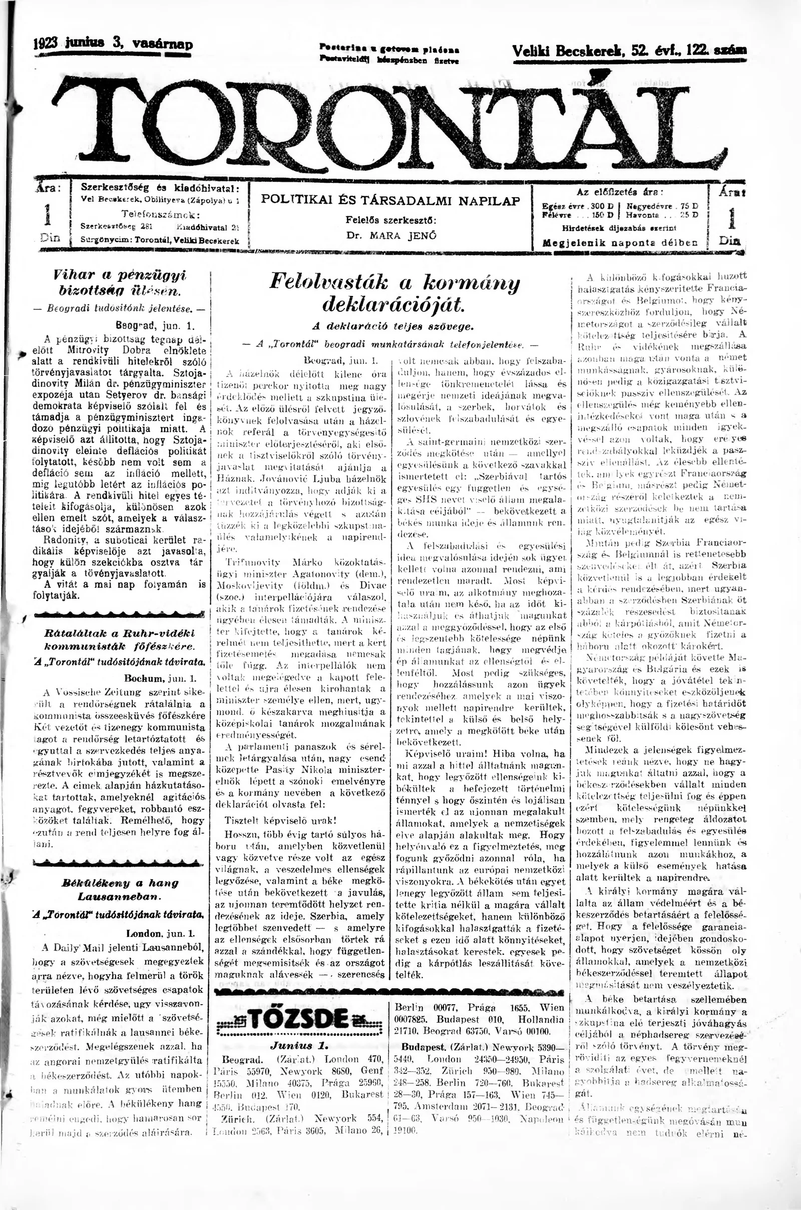 Torontál, 52. évf. 1923. június 3. 122. sz.