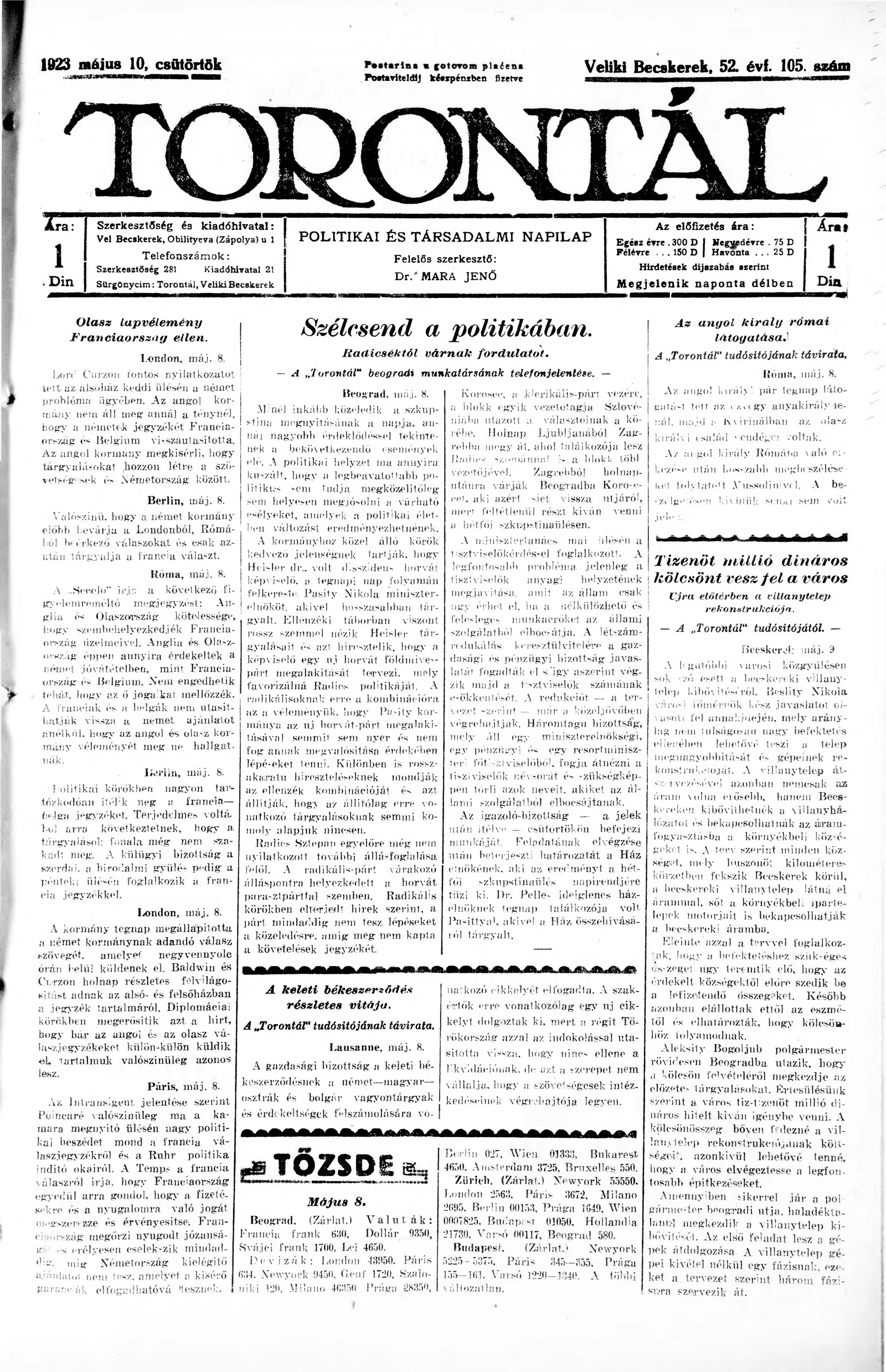 Torontál, 52. évf. 1923. május 10. 105. sz.
