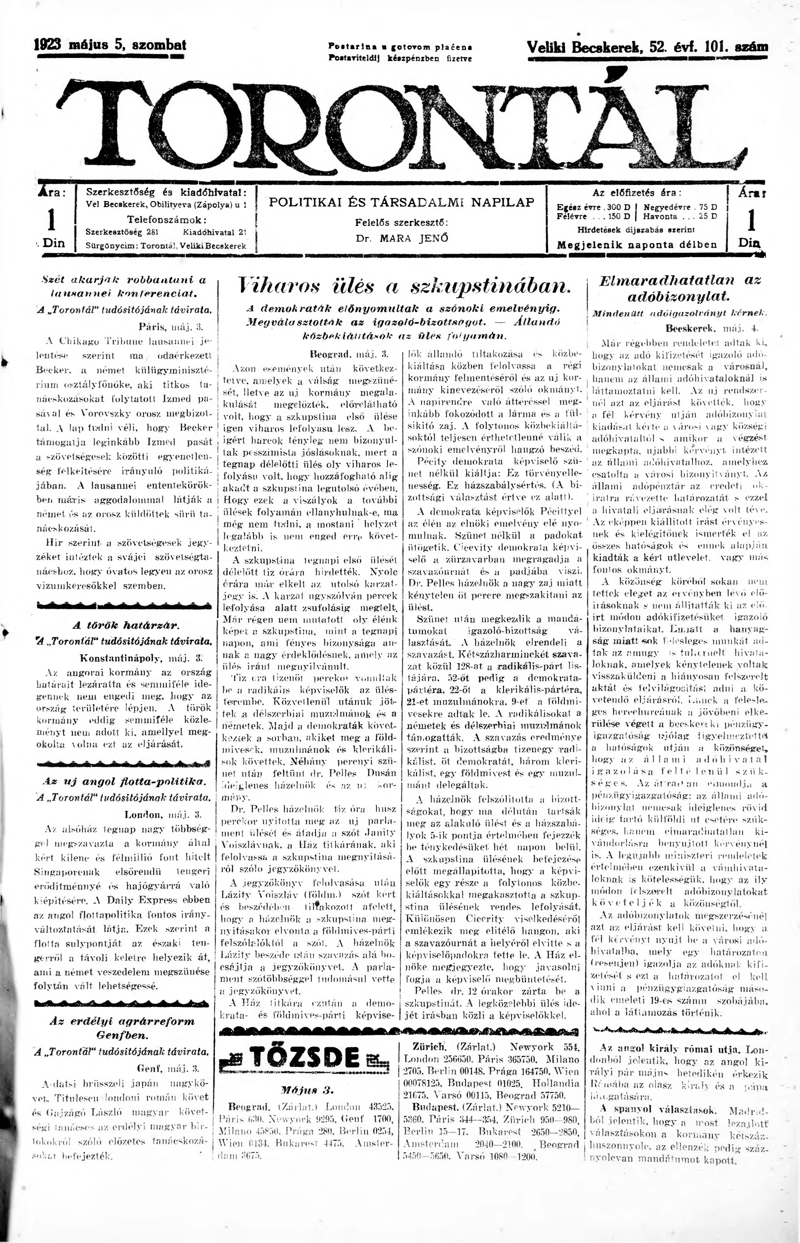 Torontál, 52. évf. 1923. május 5. 101. sz.