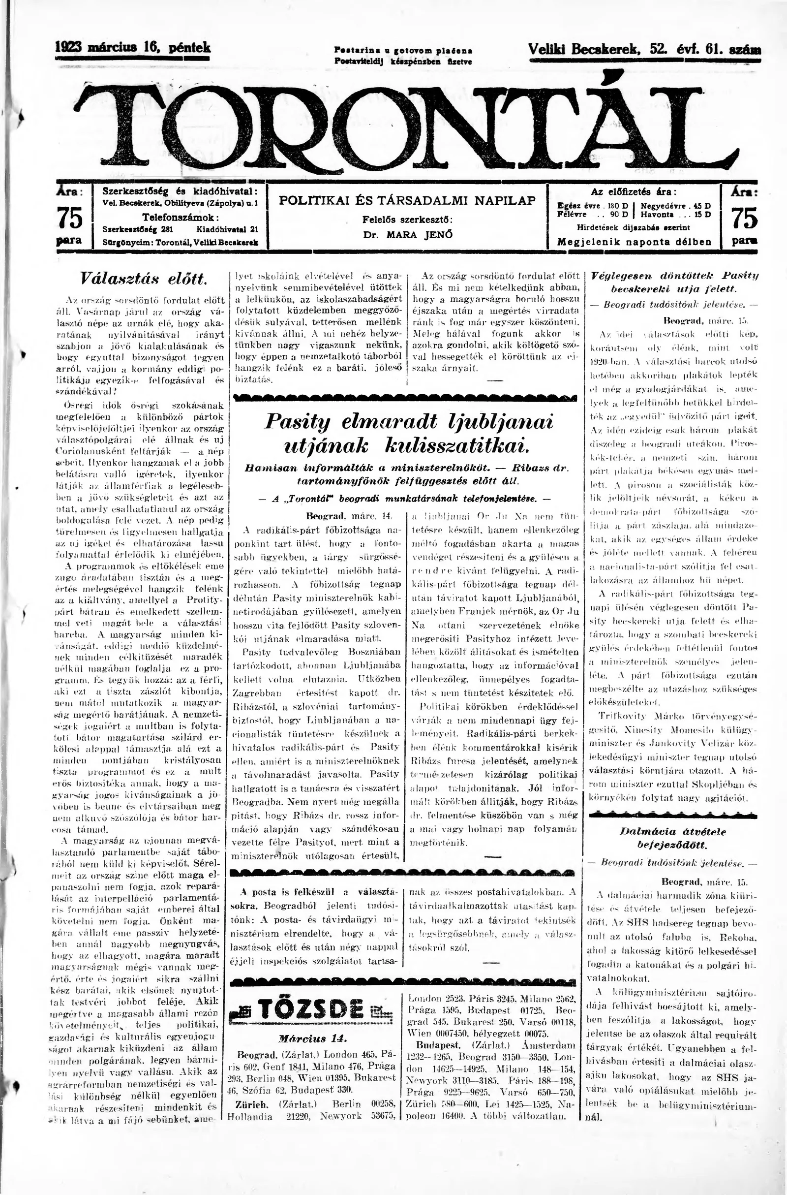 Torontál, 52. évf. 1923. március 16. 61. sz.