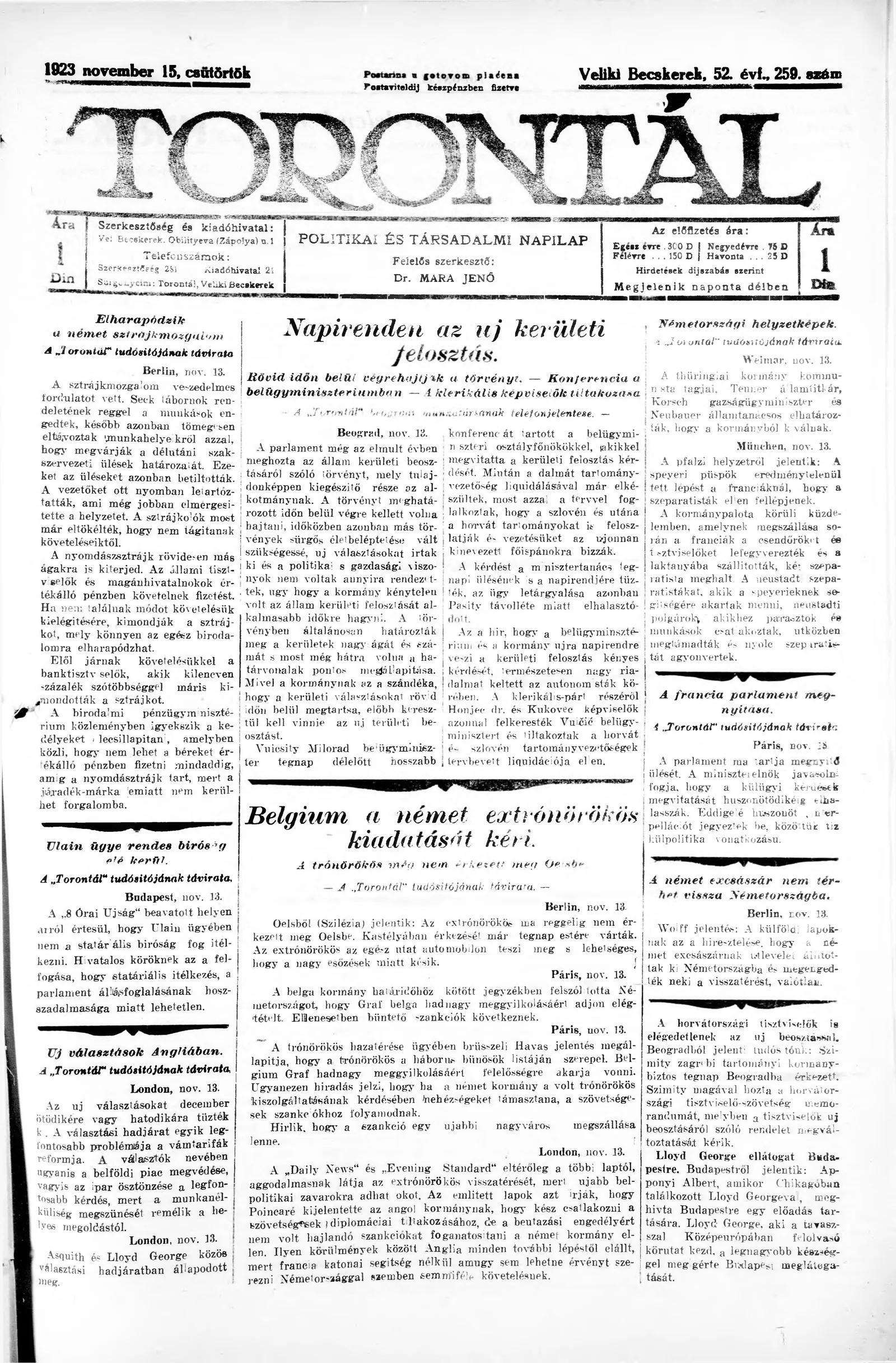 Torontál, 52. évf. 1923. november 15. 259. sz.