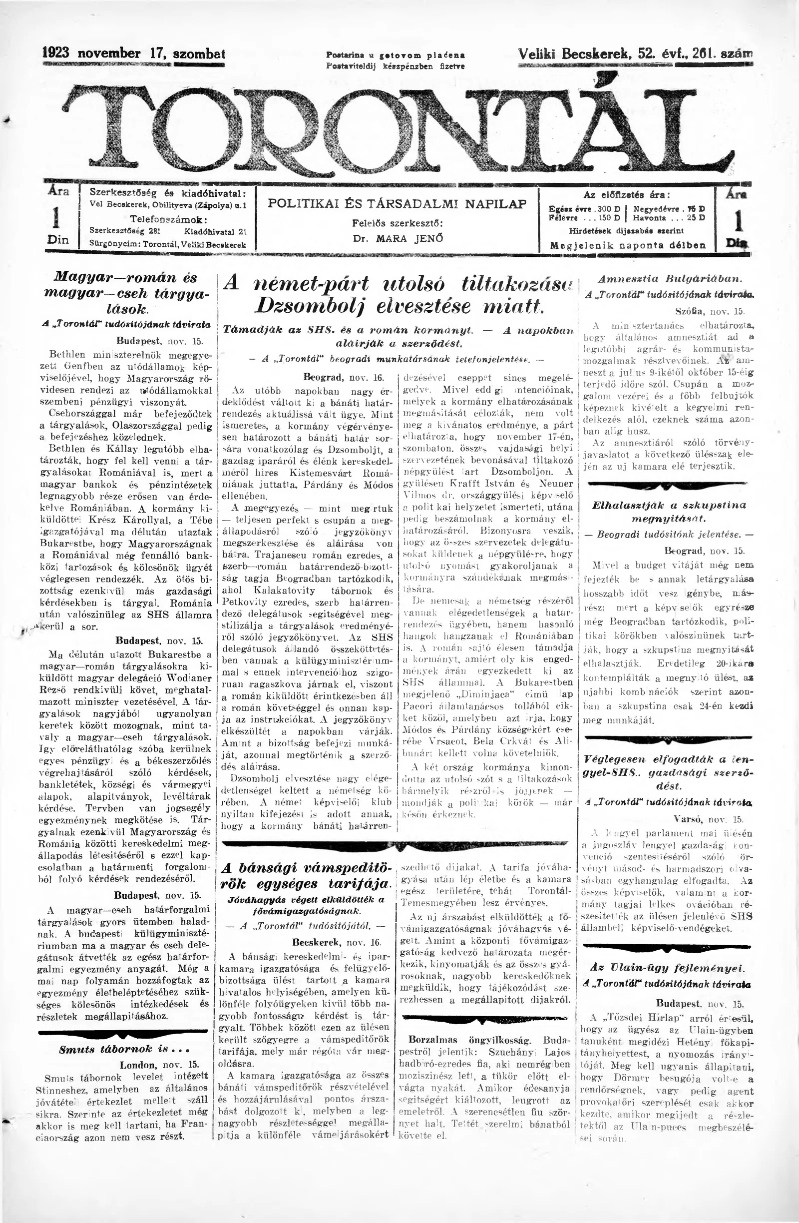 Torontál, 52. évf. 1923. november 17. 261. sz.
