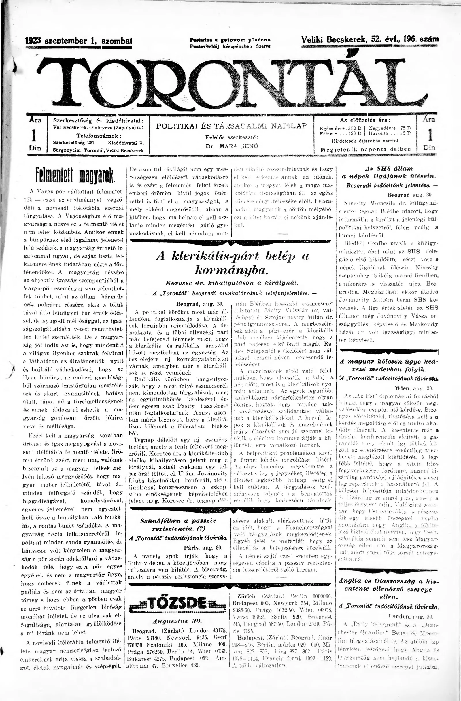 Torontál, 52. évf. 1923. szeptember 1. 196. sz.