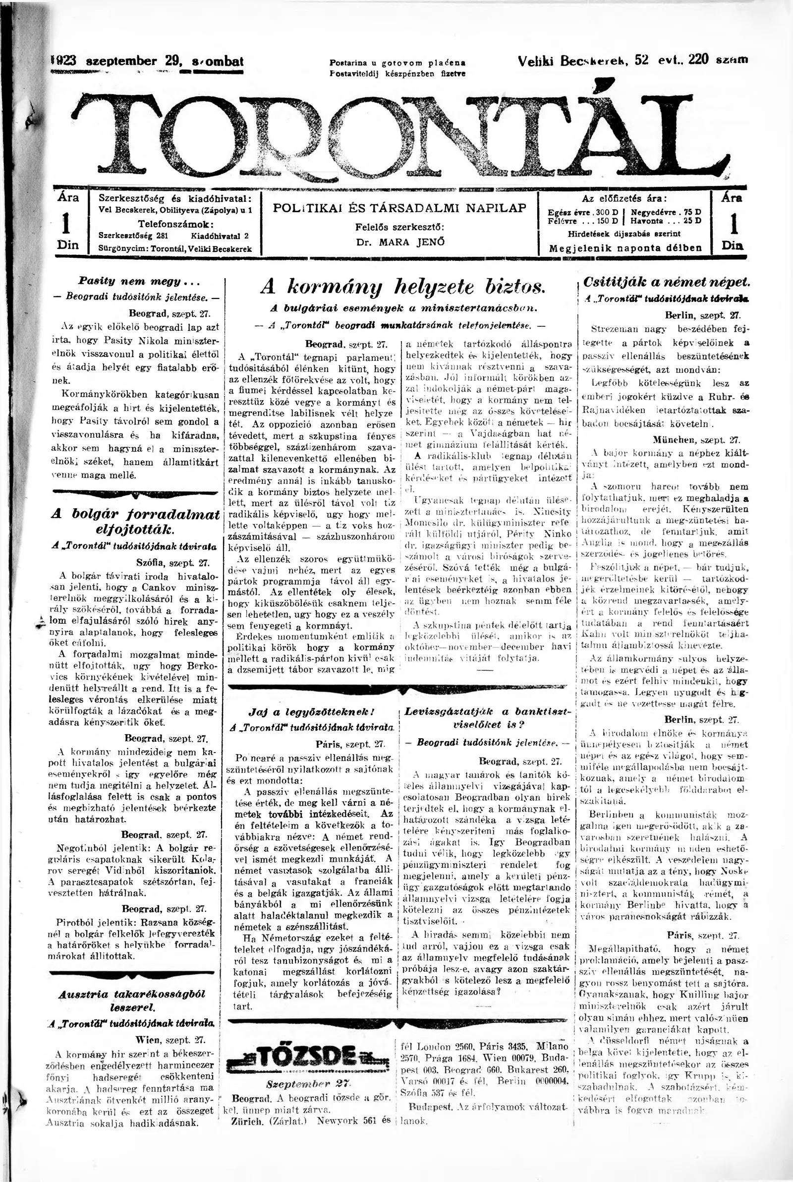 Torontál, 52. évf. 1923. szeptember 29. 220. sz.