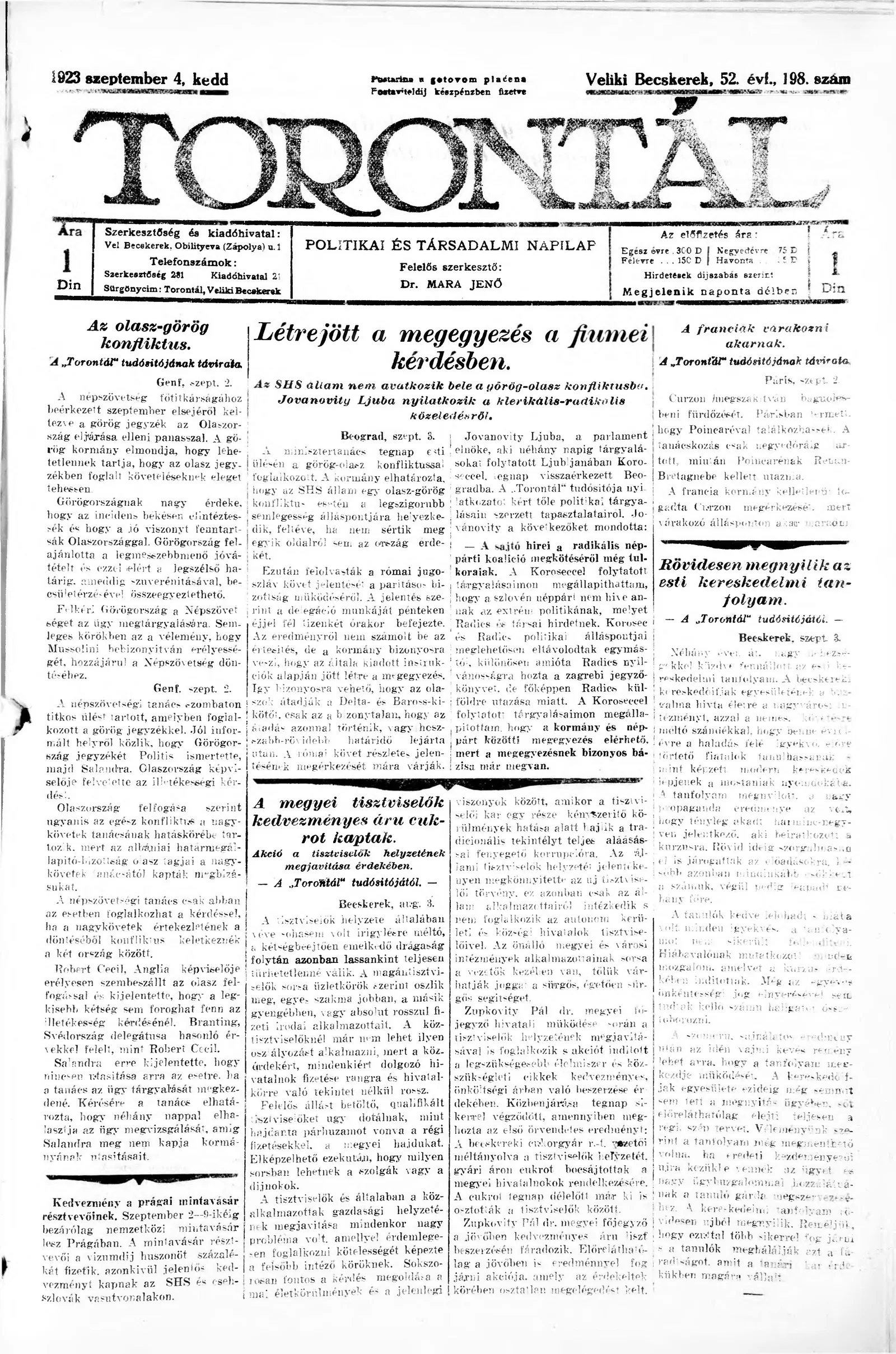 Torontál, 52. évf. 1923. szeptember 4. 198. sz.