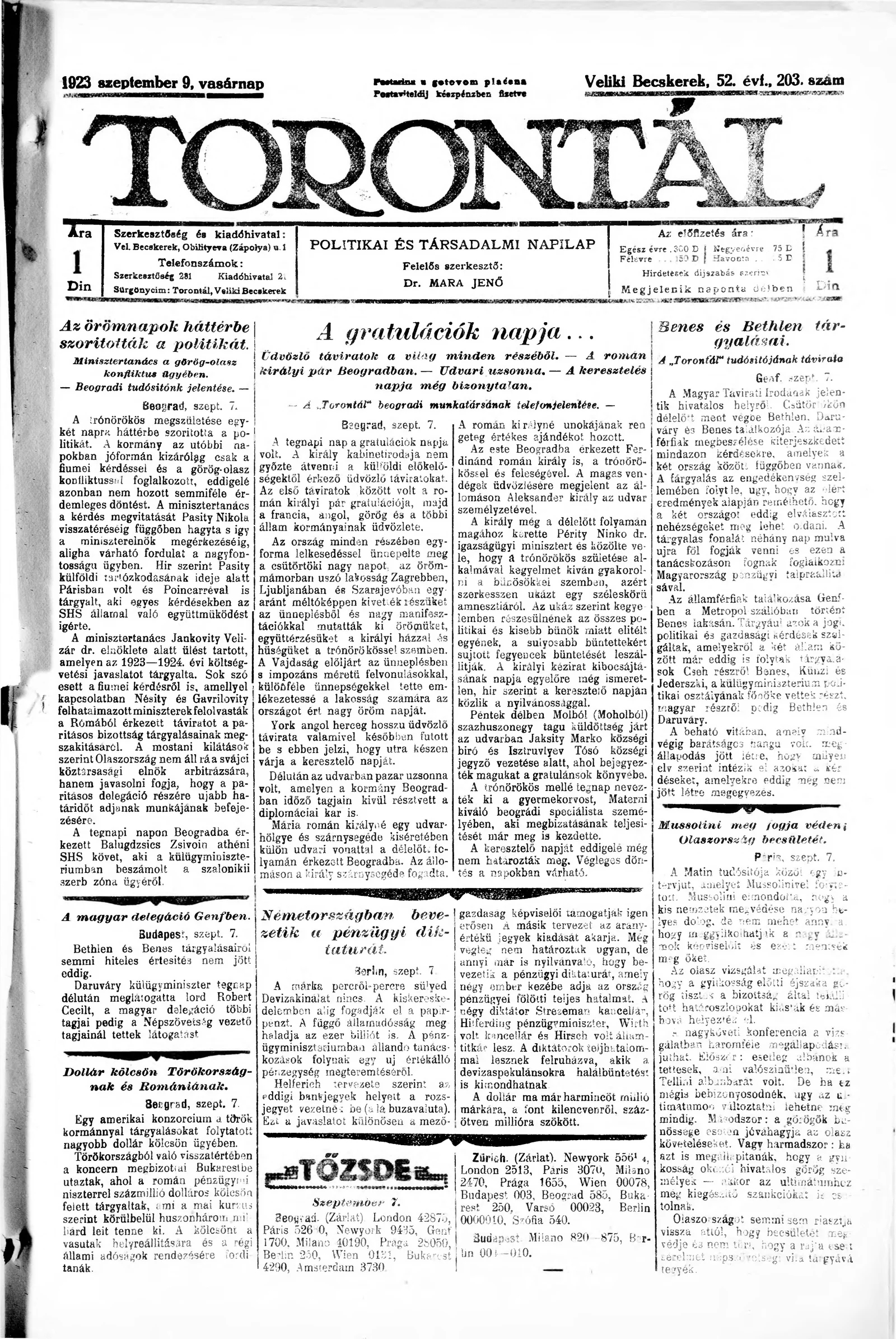 Torontál, 52. évf. 1923. szeptember 9. 203. sz.