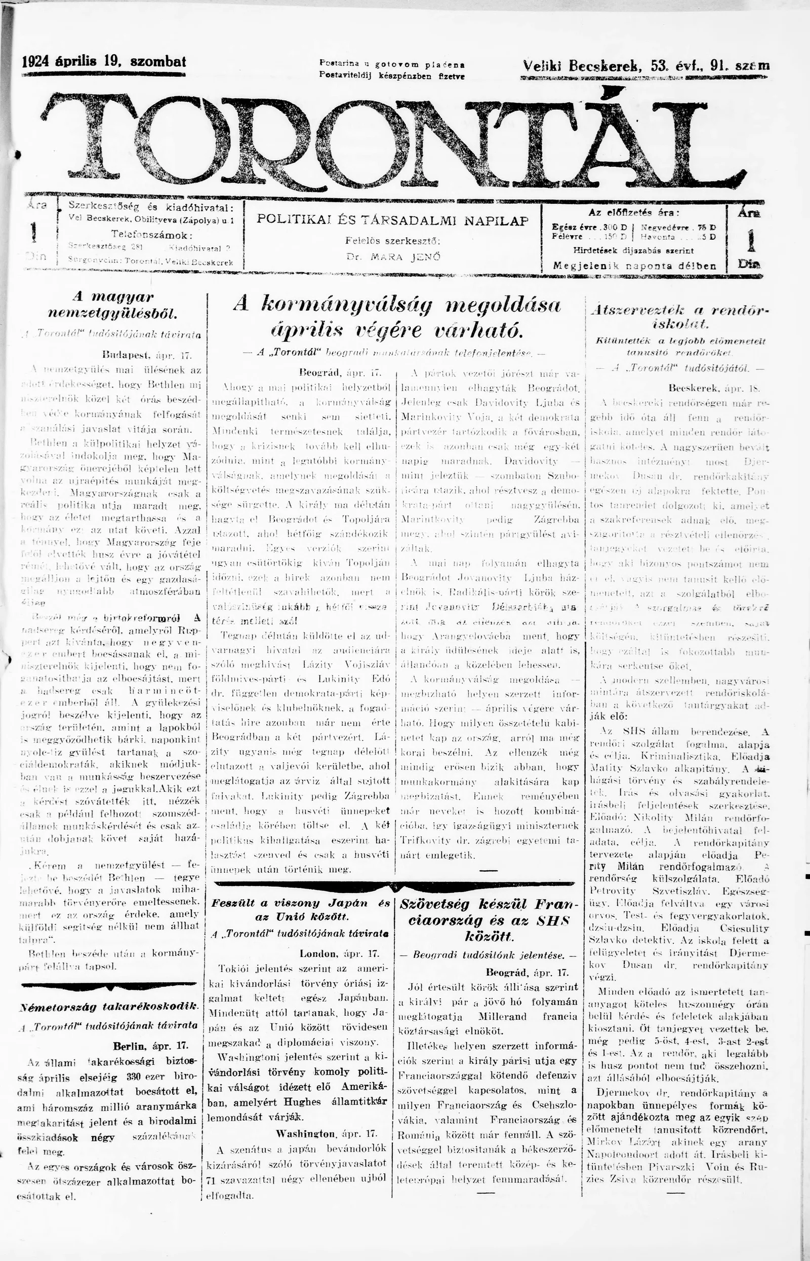 Torontál, 53. évf. 1924. április 19. 91. sz.