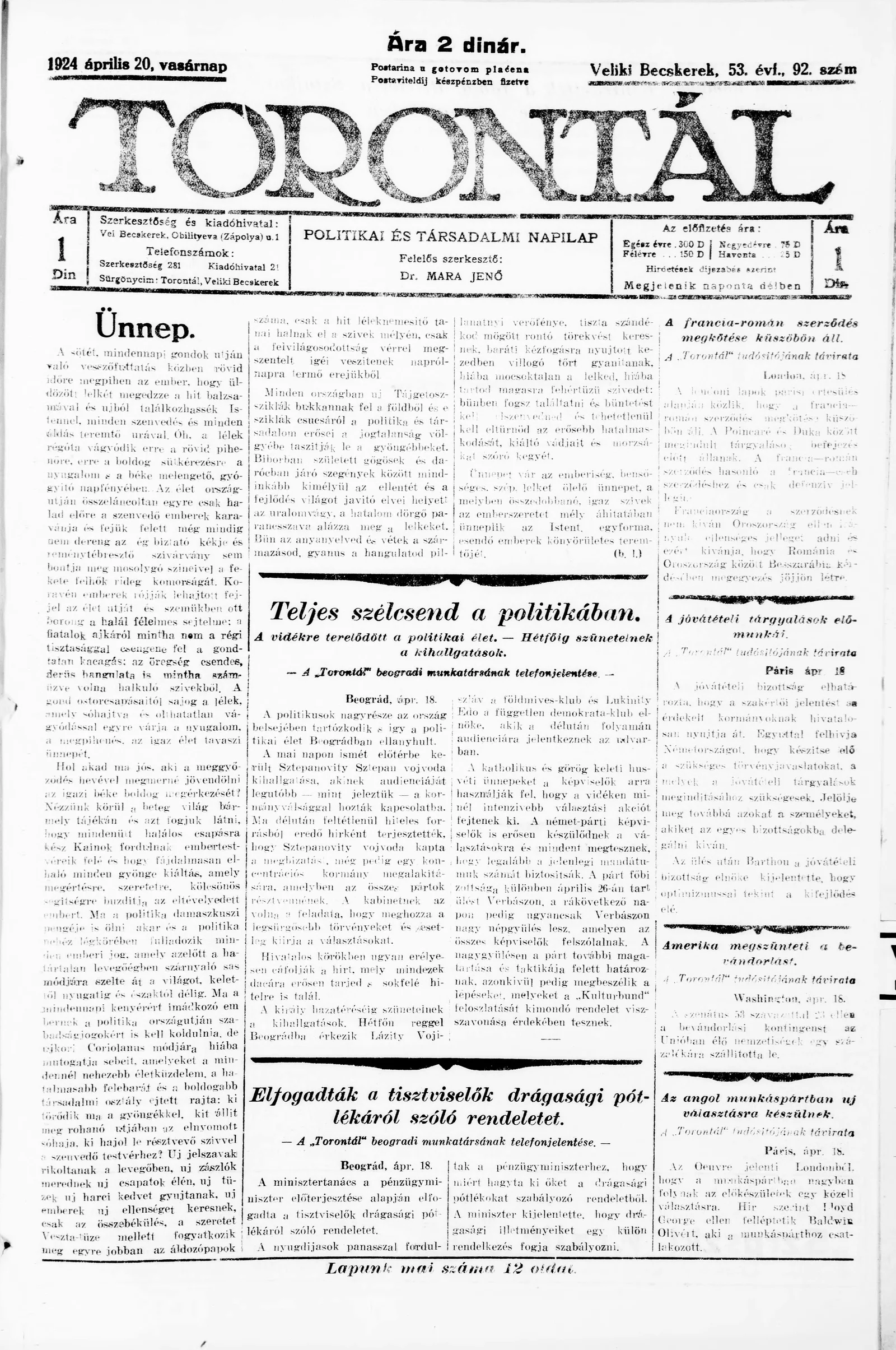 Torontál, 53. évf. 1924. április 20. 92. sz.