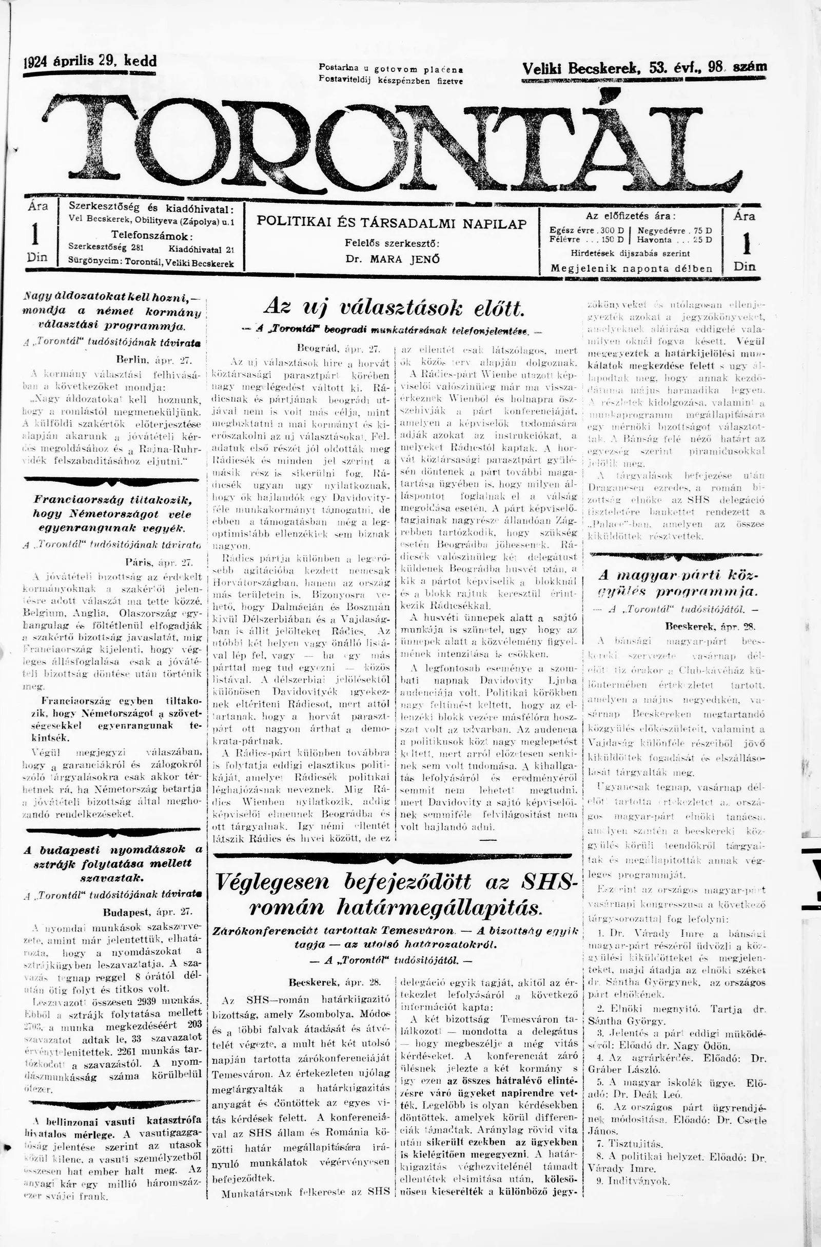 Torontál, 53. évf. 1924. április 29. 98. sz.