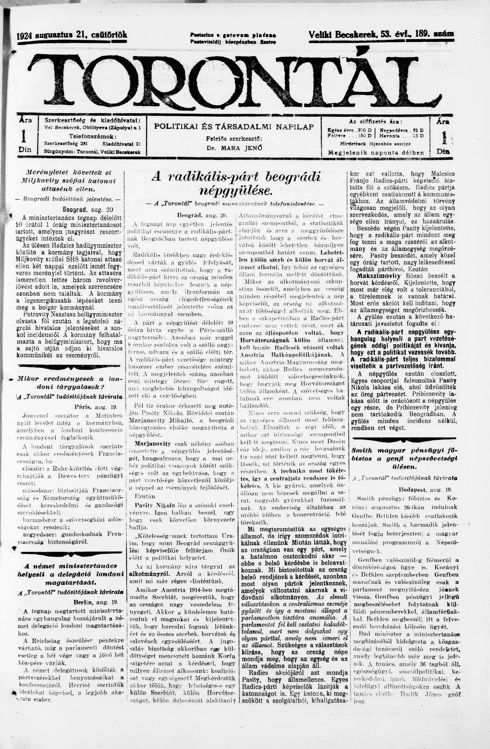 Torontál, 53. évf. 1924. augusztus 21. 189. sz.