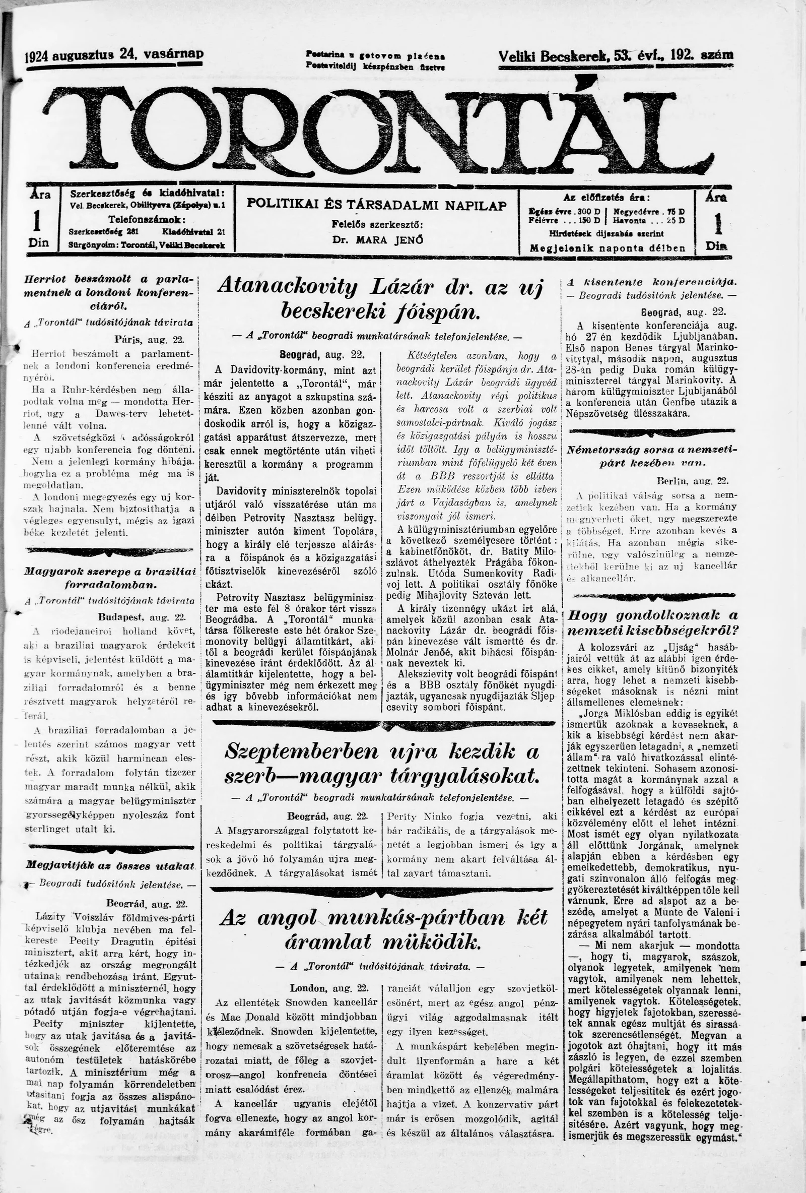 Torontál, 53. évf. 1924. augusztus 24. 192. sz.