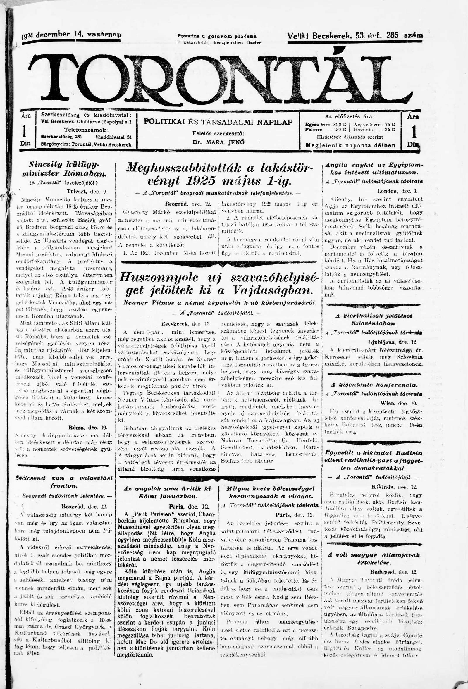 Torontál, 53. évf. 1924. december 14. 285. sz.
