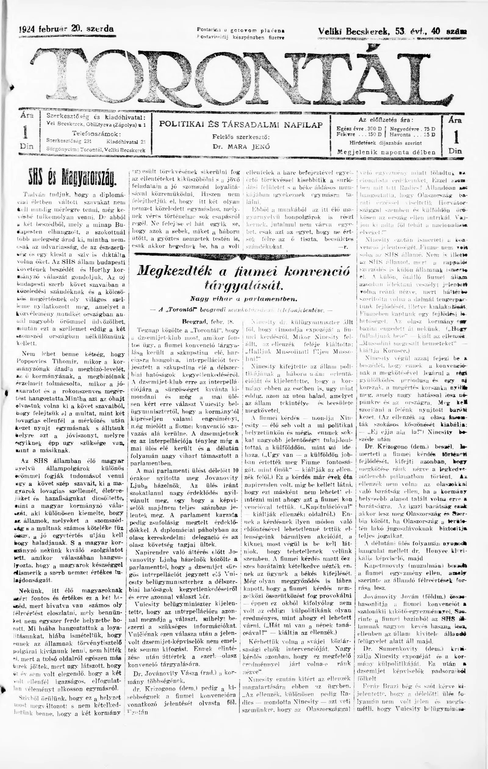 Torontál, 53. évf. 1924. február 20. 40. sz.