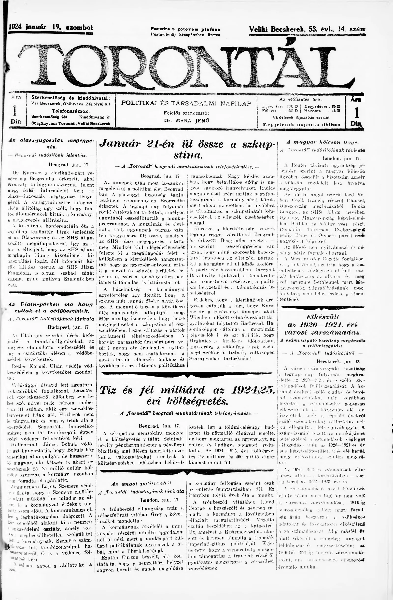 Torontál, 53. évf. 1924. január 19. 14. sz.