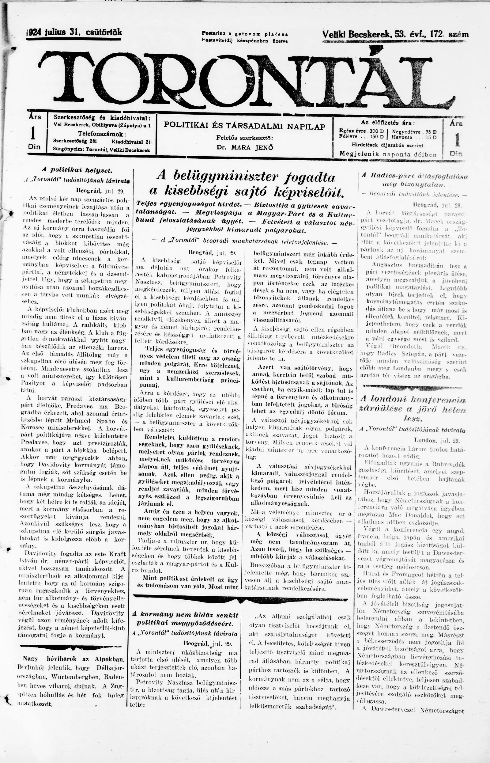 Torontál, 53. évf. 1924. július 31. 172. sz.