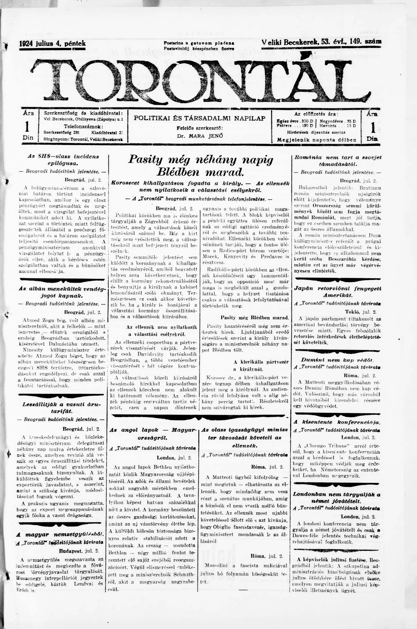 Torontál, 53. évf. 1924. július 4. 149. sz.