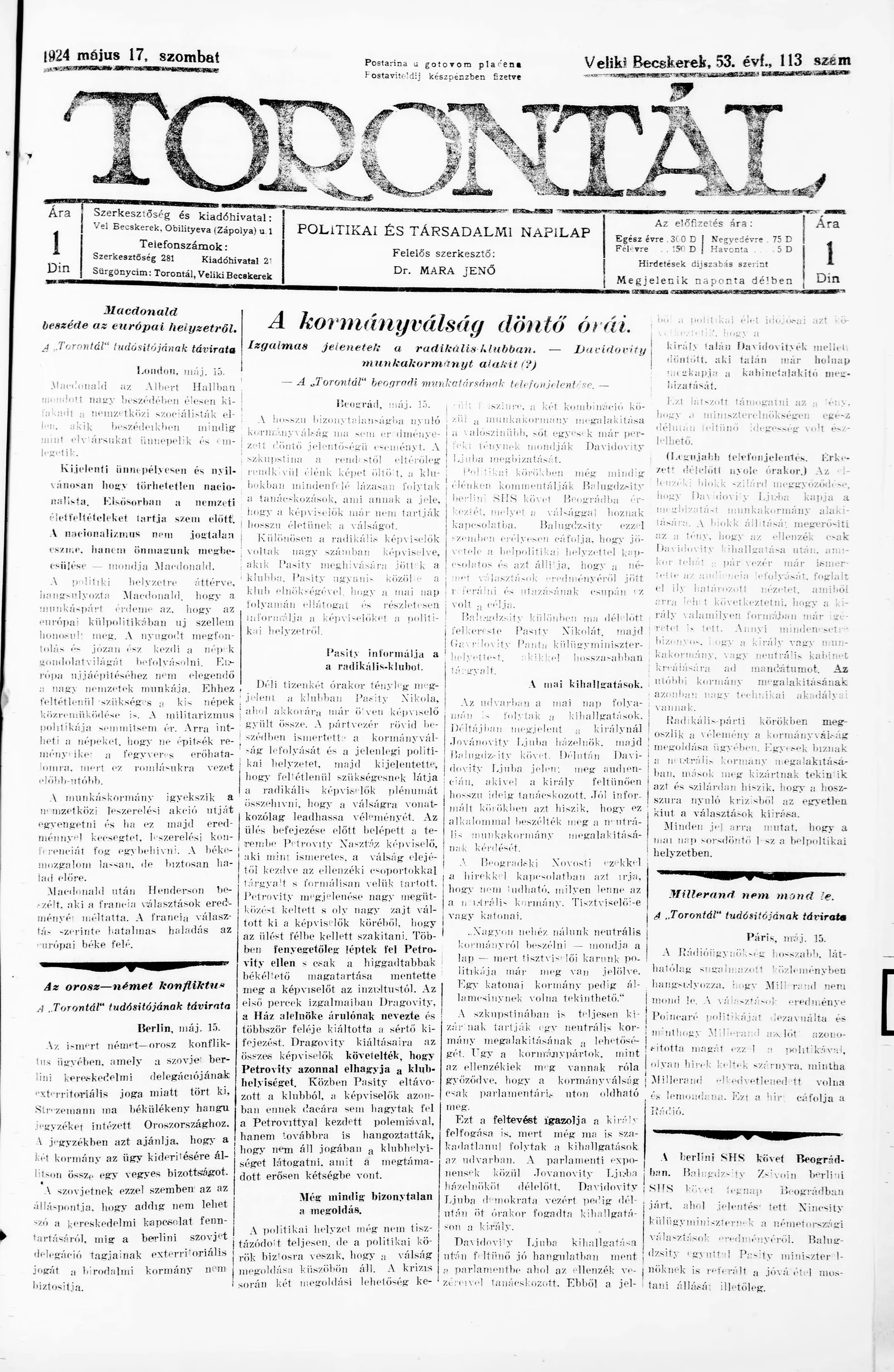Torontál, 53. évf. 1924. május 17. 113. sz.