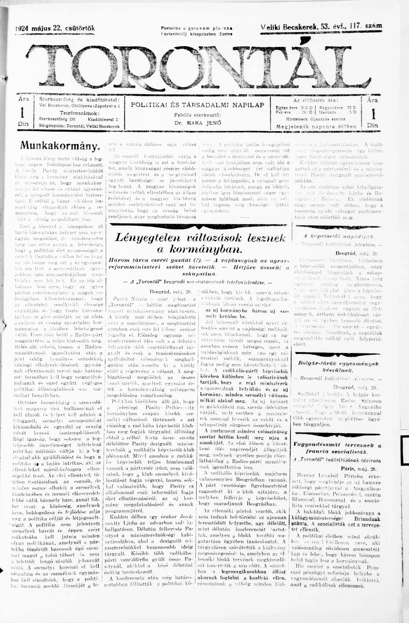Torontál, 53. évf. 1924. május 22. 117. sz.