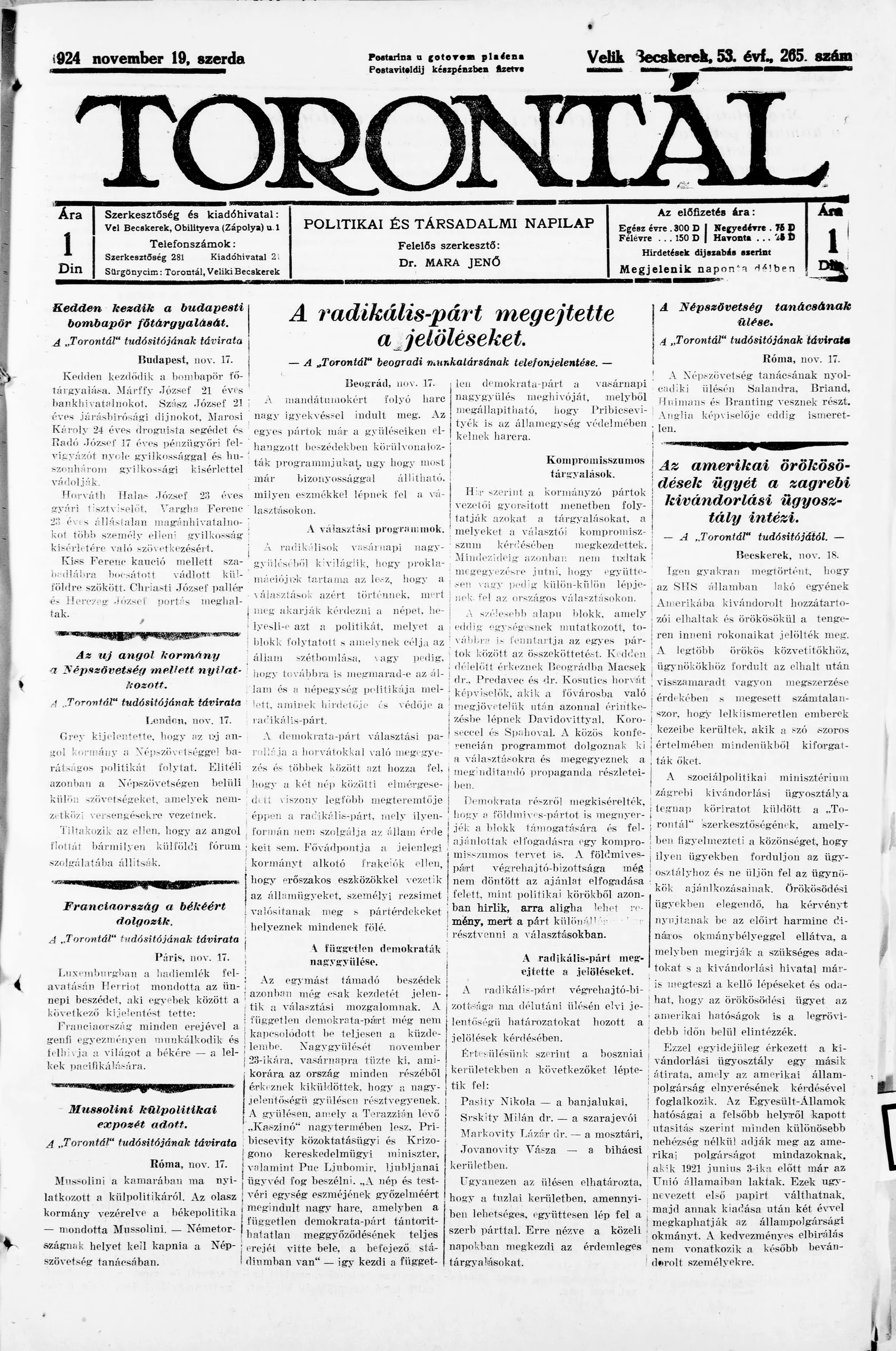 Torontál, 53. évf. 1924. november 19. 265. sz.