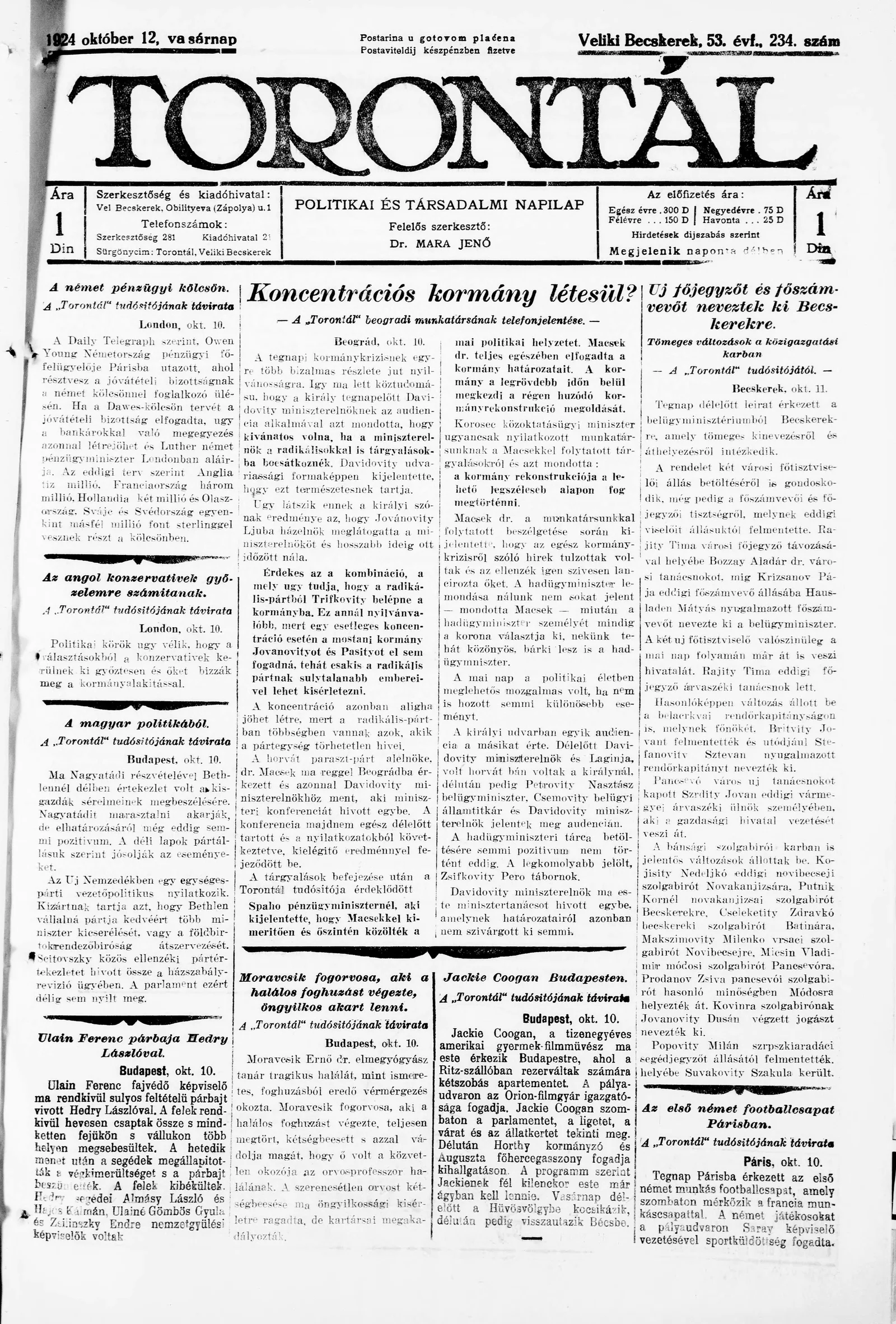 Torontál, 53. évf. 1924. október 12. 234. sz.