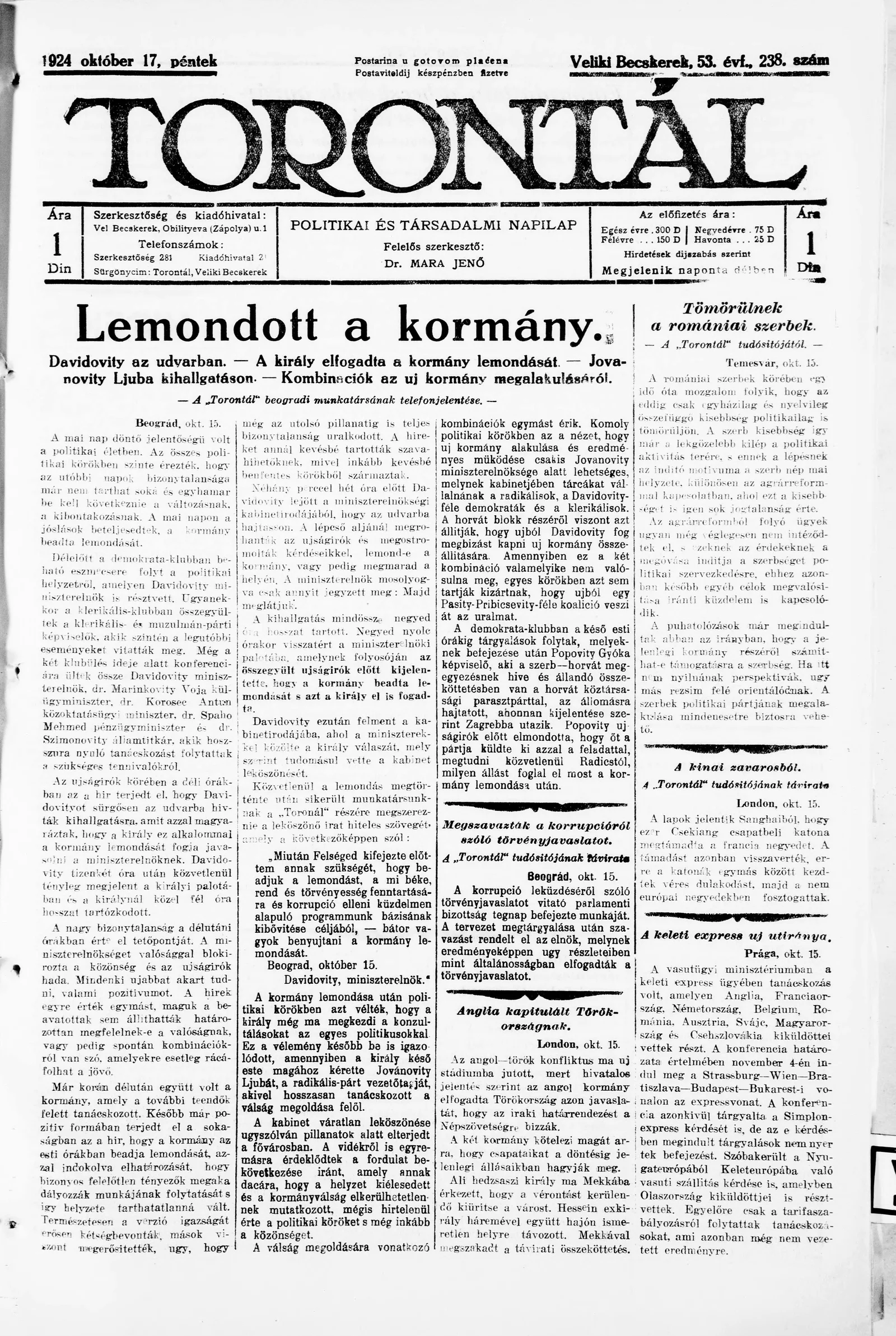 Torontál, 53. évf. 1924. október 17. 238. sz.