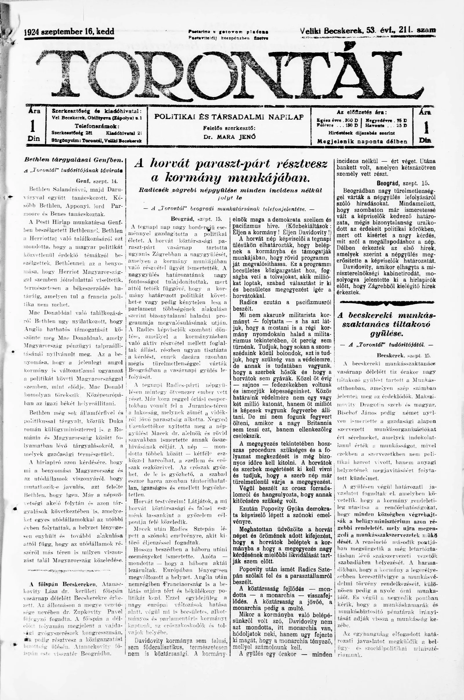 Torontál, 53. évf. 1924. szeptember 16. 211. sz.