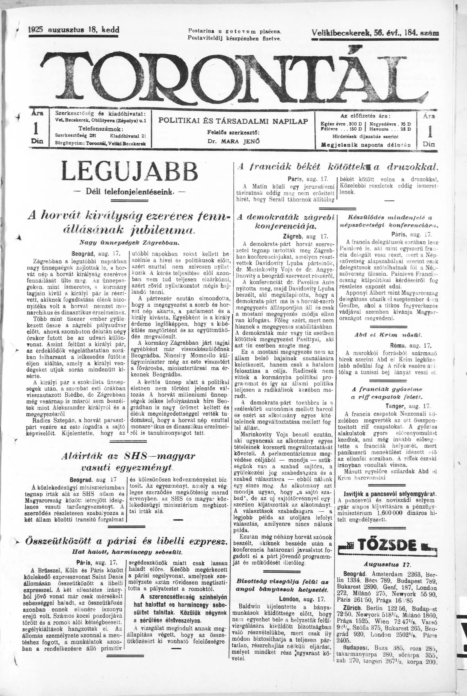 Torontál, 54. évf. 1925. augusztus 18. 184. sz.