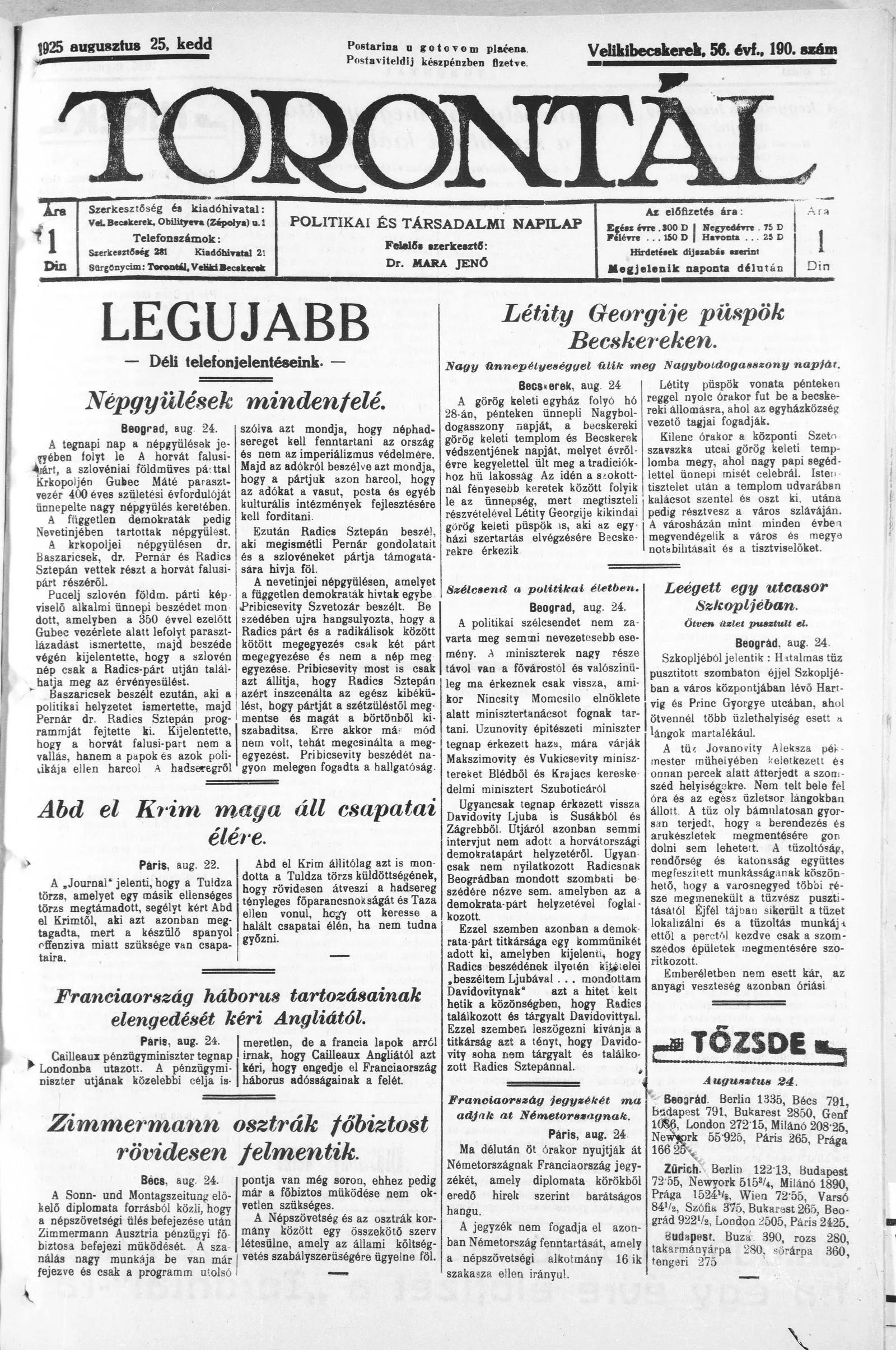 Torontál, 54. évf. 1925. augusztus 25. 190. sz.