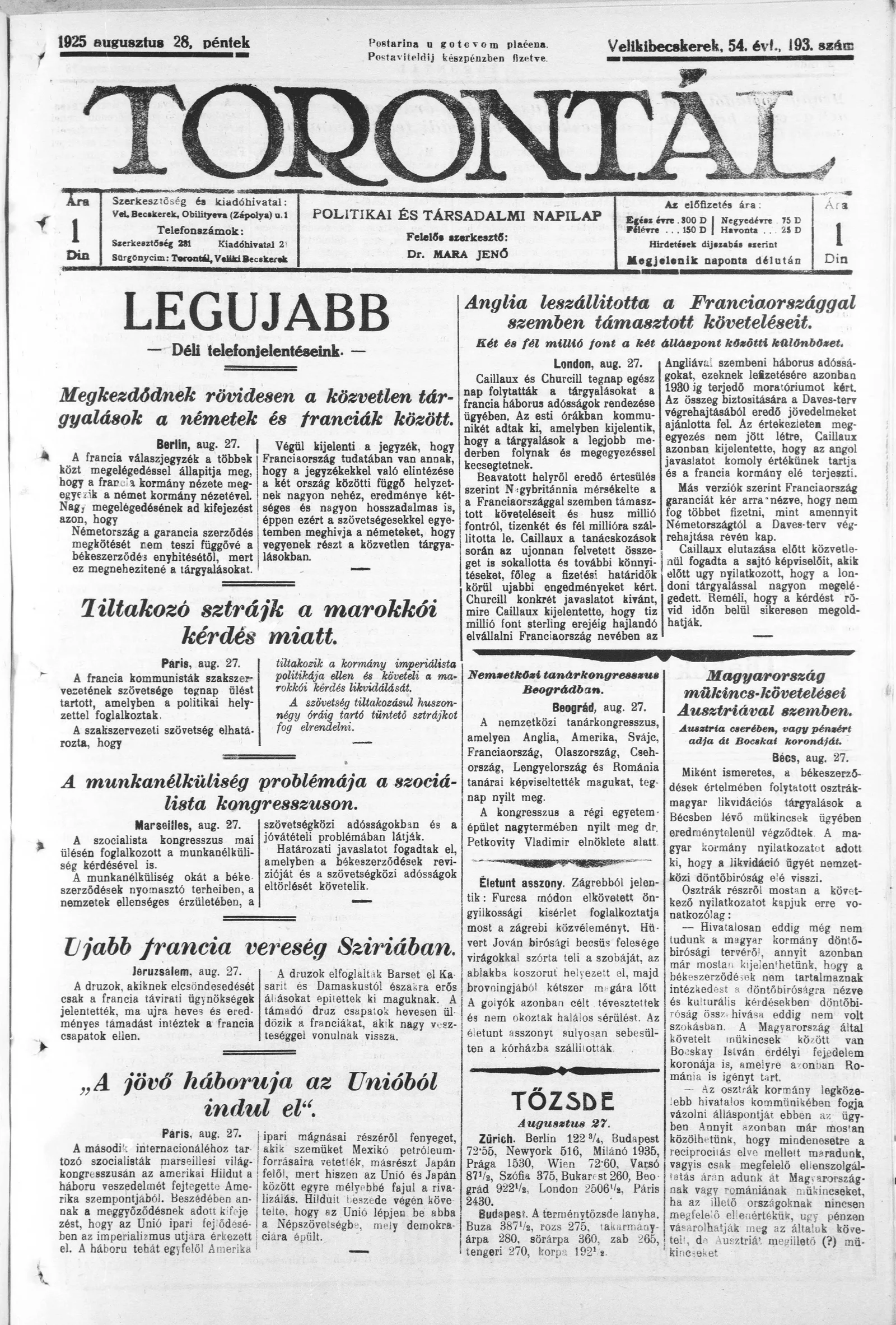 Torontál, 54. évf. 1925. augusztus 28. 193. sz.