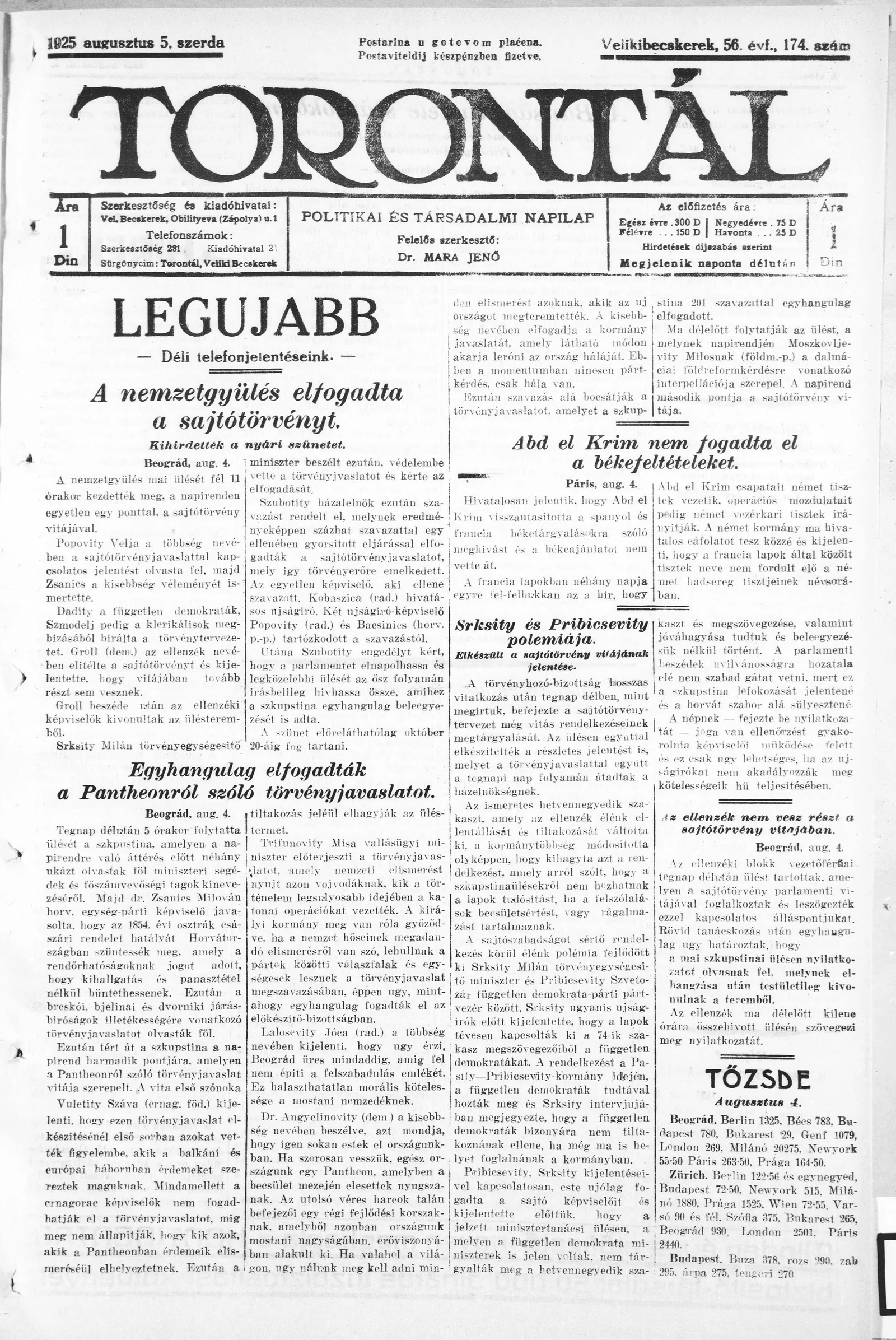 Torontál, 54. évf. 1925. augusztus 5. 174. sz.