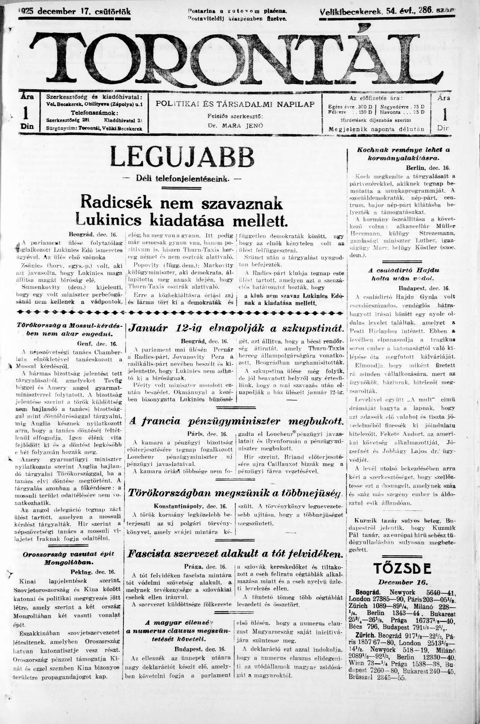 Torontál, 54. évf. 1925. december 17. 286. sz.