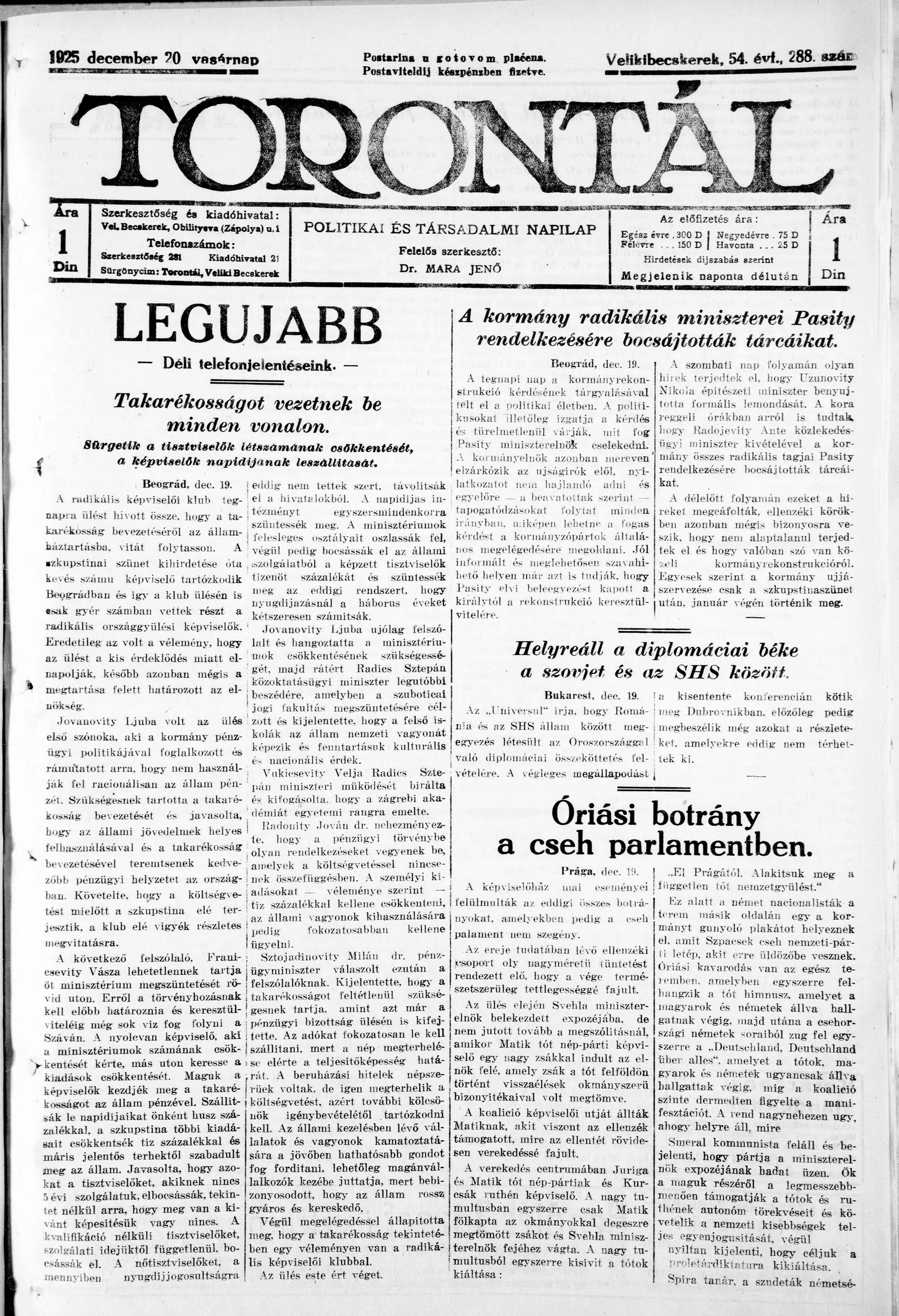Torontál, 54. évf. 1925. december 20. 288. sz.