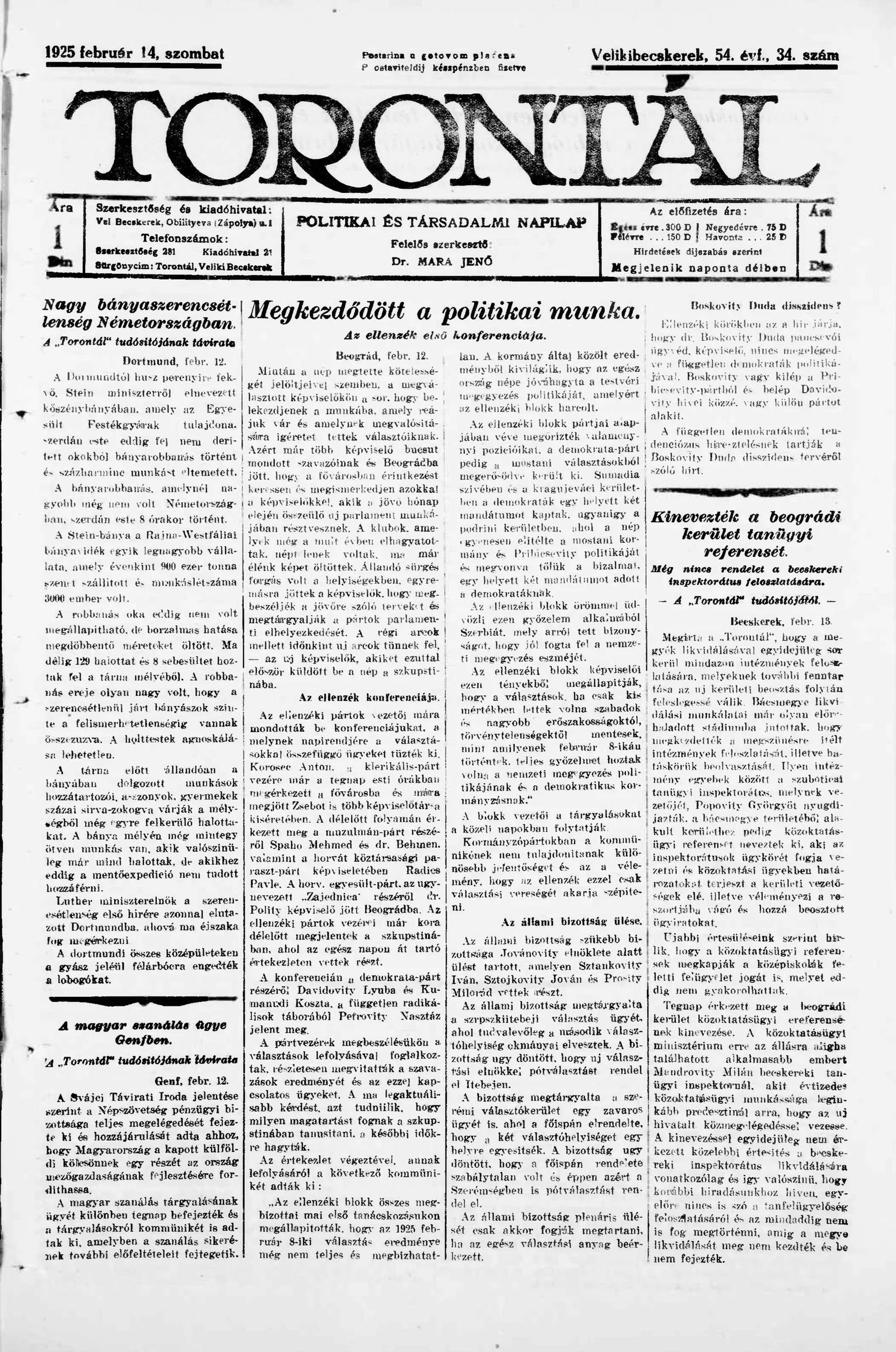 Torontál, 54. évf. 1925. február 14. 34. sz.