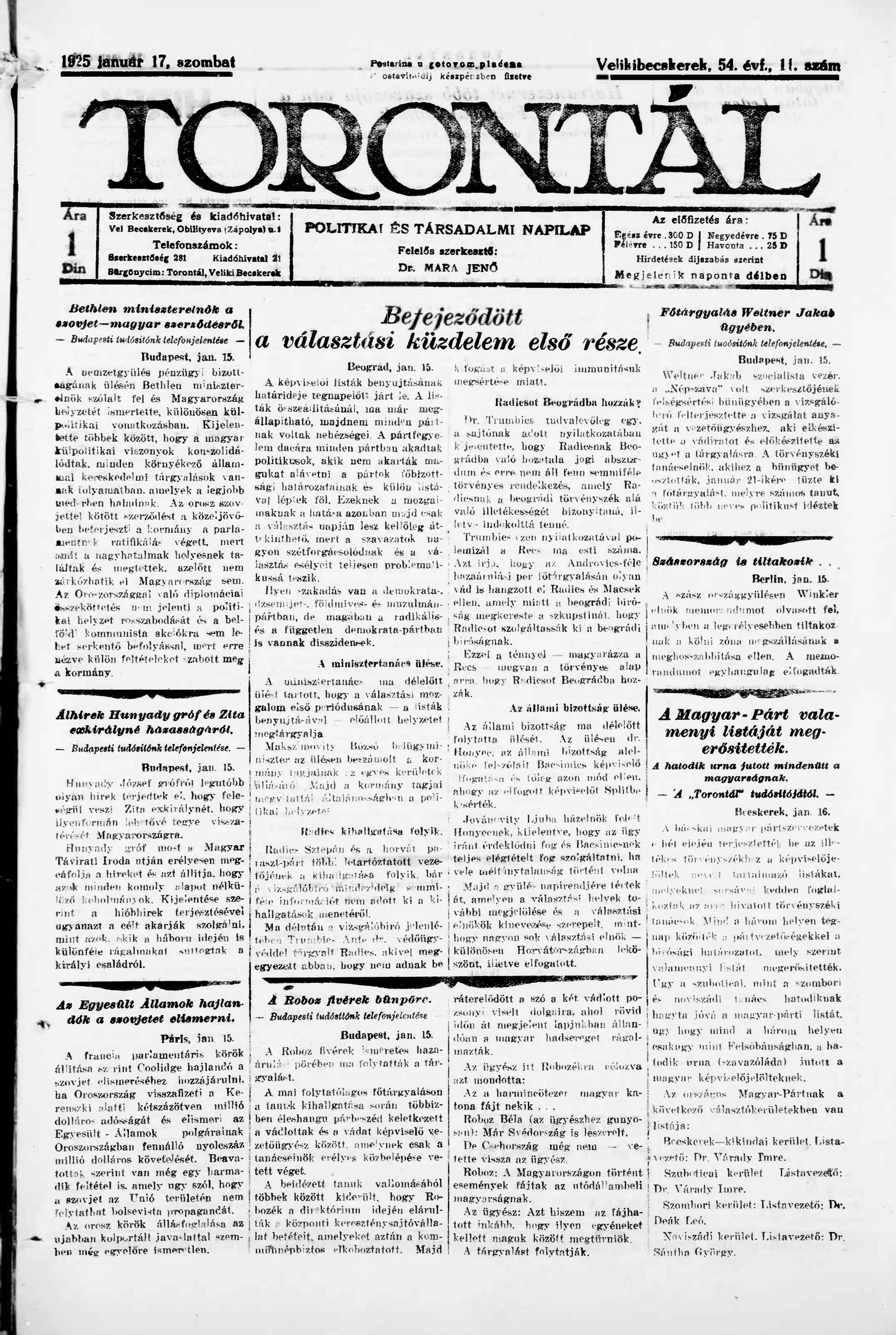 Torontál, 54. évf. 1925. január 17. 11. sz.